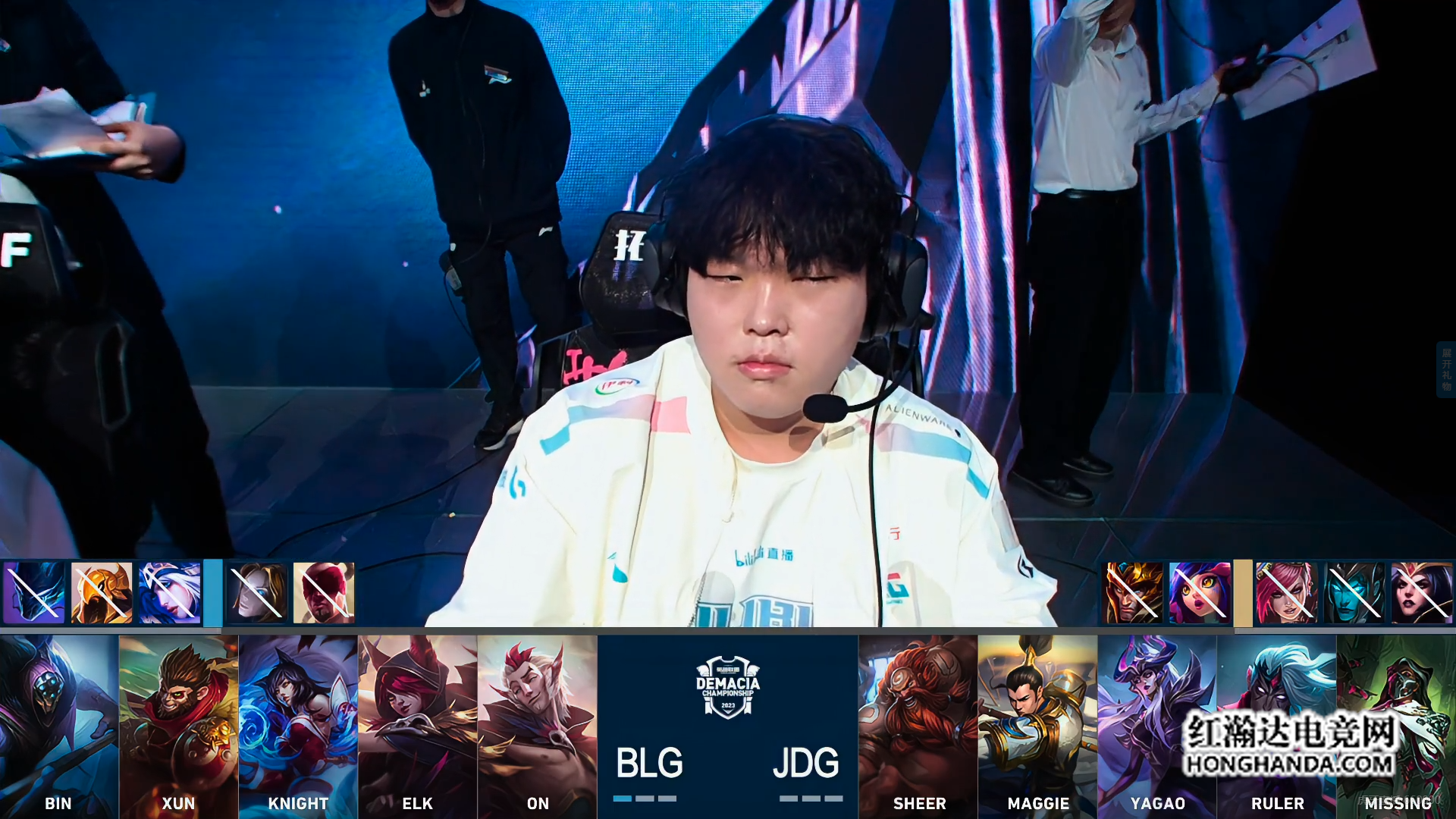 第二局比赛的前期,与第一局前期完全是一个镜像。BLG下路组面对对线强势的韦鲁斯与烈娜塔,只能守在塔下。knight阿狸则是在前期帮助BLG打开局面,先是拿到上路一血,然后又在队友的帮助下将JDG打野击杀。