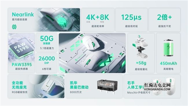 机械师 L8Max/Air超级电竞鼠标,作为全球首款星闪技术右手非对称人体工学鼠标,这两款鼠标采用双星闪主控,一对一专属高速信道,超大带宽,带来了0.25ms的超低延迟!采用业界少有的极致轻量化,非对称人体工学设计,手感舒适、定位精准,能够满足不同玩家的需求。同时,机械师 L8Max鼠标还标配RGB磁吸充电座充,消除了用户的续航焦虑,让充电更加便捷。