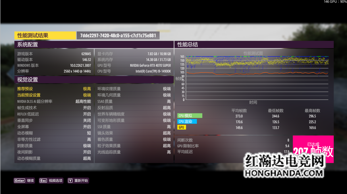 开启DLSS性能模式,帧数直接来到了207帧,提升幅度达150%。