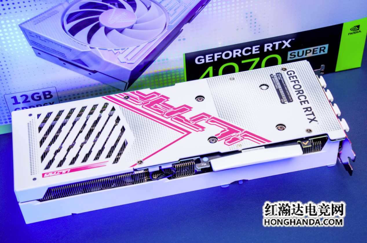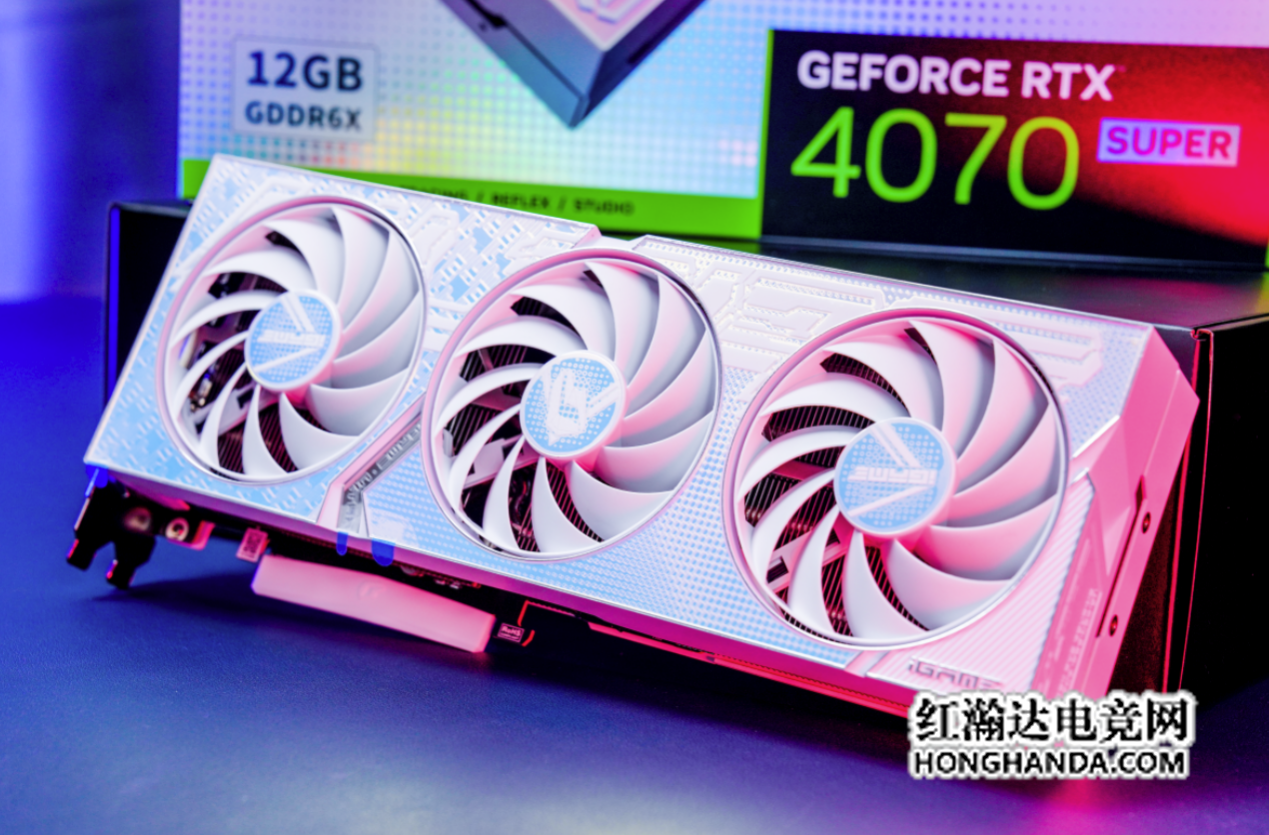 iGame GeForce RTX 4070 SUPER Ultra W OC 12GB显卡外观沿用了“白色波普外甲”风格设计,大面积的贝壳渐彩涂层能在不同光线下呈现出绚丽的色彩,侧面的RGB灯组面积也有增大,霓虹光效更加明显,三把11扇叶的90mm散热风扇+4根6mm热管能够提供高效的散热能力,实测中可快速将显卡温度控制在较低范围。