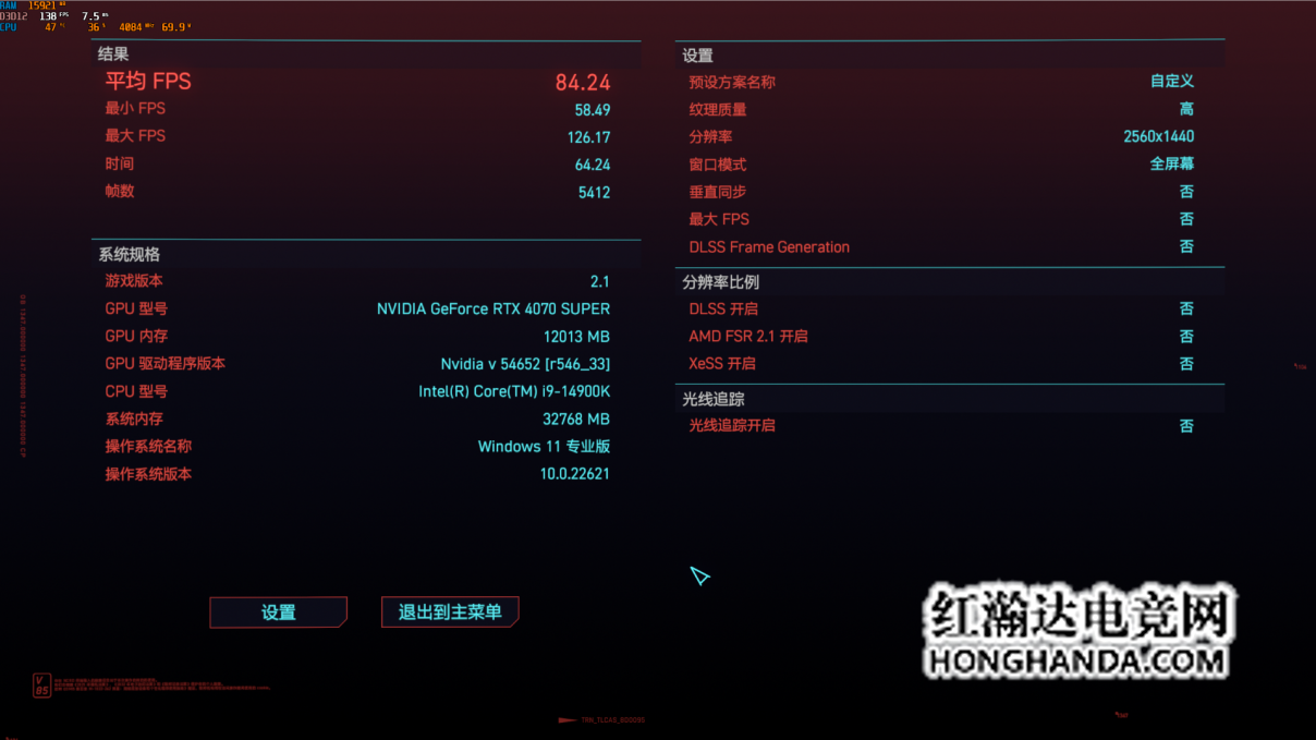 跑完基准测试我们接下来测测游戏,首先登场的是《赛博朋克2077》,在不开DLSS不开光追的情况下,2K分辨率只能跑84.24帧。