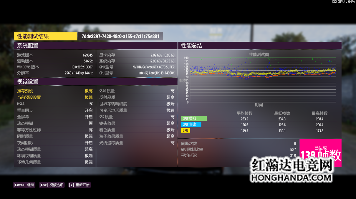 《极限竞速地平线5》2K分辨率,关闭DLSS,极端预设,帧数为:138帧。