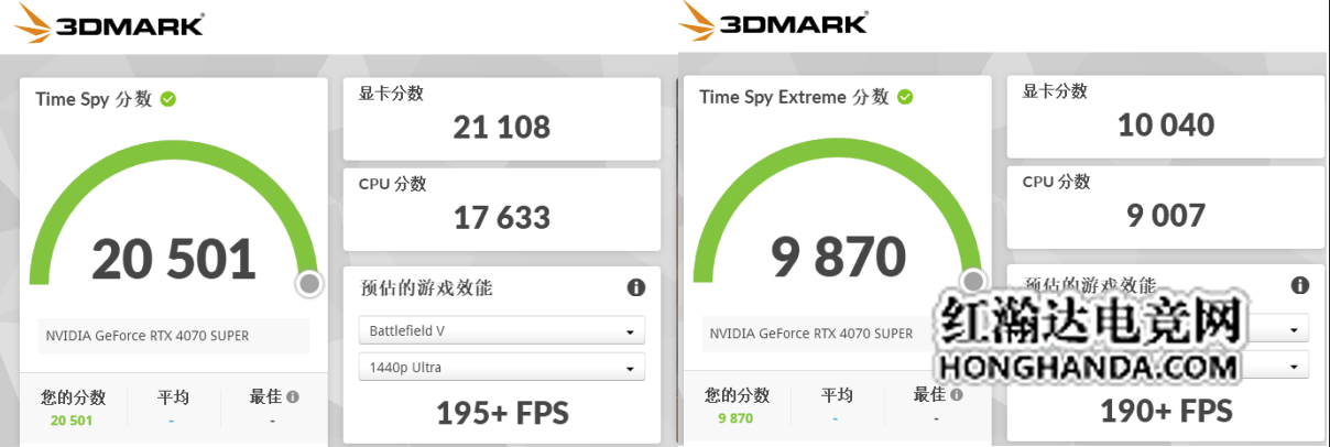 首先进行的是3DMark的测试,Time Spy整体分数为20501,其中显卡分数为21108,在Time Spy Extreme测试中,整体分数9870,显卡分数为10040,对比接近RTX 4070 Ti的分数,相差个位数百分比。