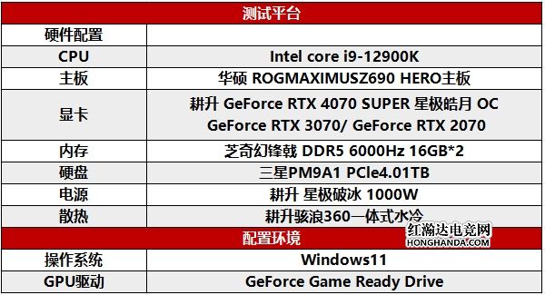 本次测试环节的CPU使用了Intel Core i9-12900K,主板方面选择了ROG MAXIMUS Z690 HERO主板,内存方面启用2条芝奇 幻锋戟 DDR5 6000Hz 16GB,电源采用的是耕升星极破冰1000W电源,散热方面则是耕升 骇浪360 一体式水冷,这套散热配置可以为GPU提供足够的降温以及供电 ,这套配置在正常使用中,可以完美的发挥耕升GeForce RTX 4070 SUPER 星极皓月 OC的性能,同时本次测试将同时与GeForce RTX 3070 和GeForce RTX 2070 进行直接比对,让我们来看看耕升GeForce RTX 4070 SUPER 星极皓月 OC的优越表现吧。
