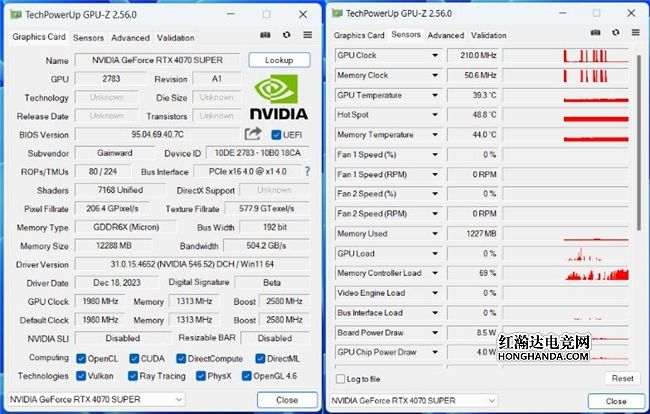 通过更新至最新的GPU Z 2.56版本,玩家们可以得到耕升GeForce RTX 4070 SUPER 星极皓月 OC中更为具体的参数表现和实际规格,通过数据我们可以看到显卡在待机状态下温度为39.3度,功耗为8.5W。