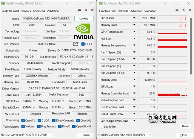 通过GPU-Z可以得到影驰GeForce RTX 4070 Ti SUPER金属大师 的产品规格和基本参数,其待机温度为38.4°C,功耗为20W。