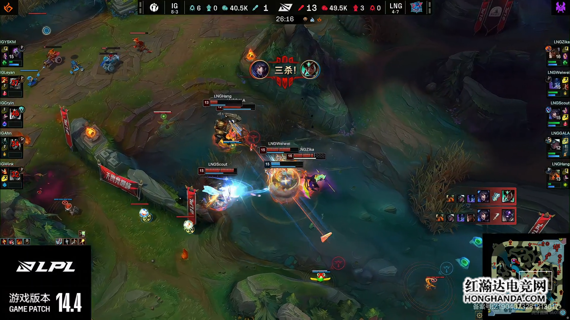 两队在第三条小龙刷新的时候,一共打了两拨团战,第一次IG打出2换4,第二次IG直接将LNG团灭,并拿下听牌龙与大龙。LNG开始受到IG的推进。