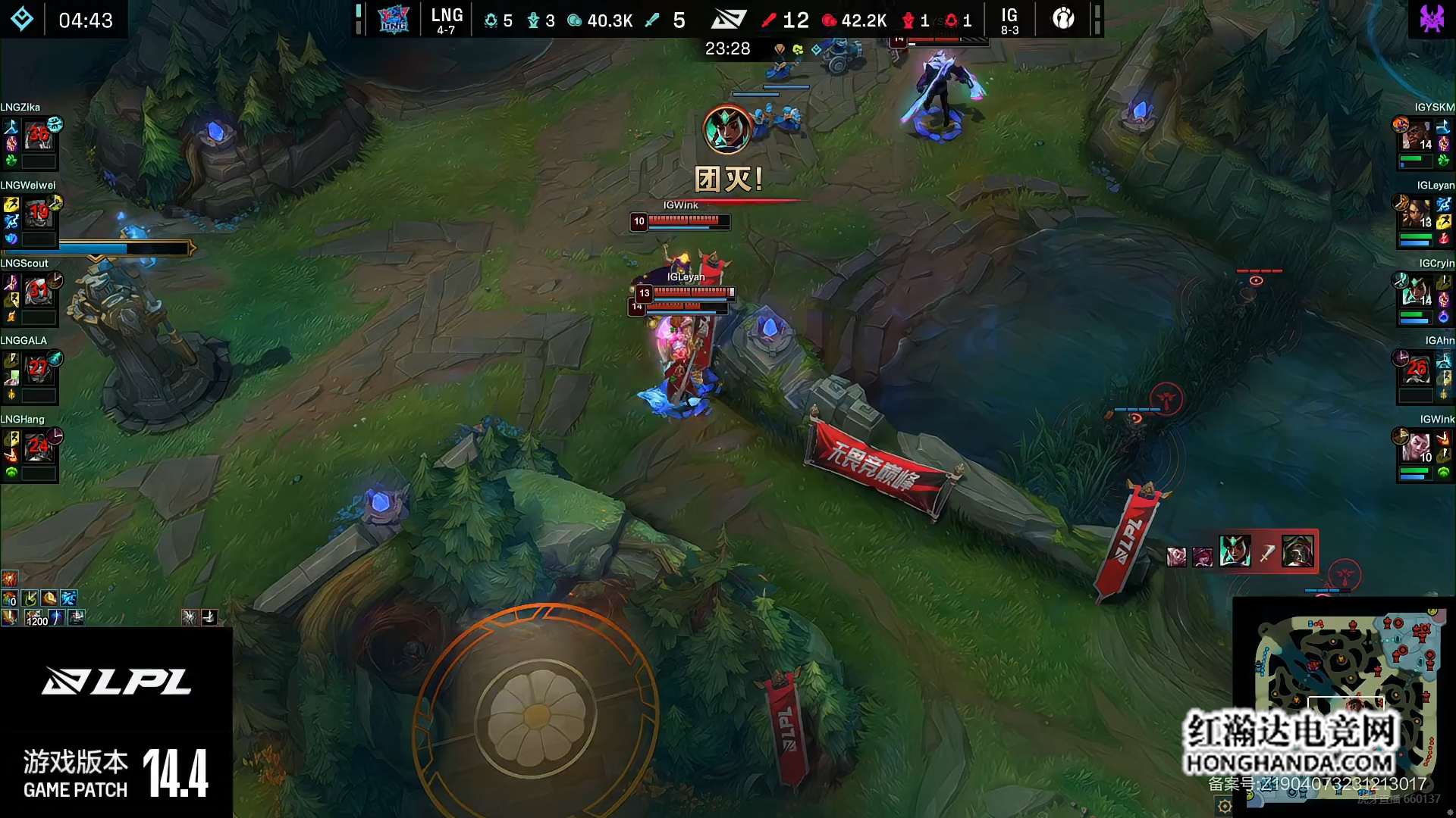 LNG在26分钟龙魂团团灭IG拿下火龙魂与大龙,随后两分钟IG主动开团,被LNG直接关灯打出团灭,LNG直接一波中推拿下比赛胜利。