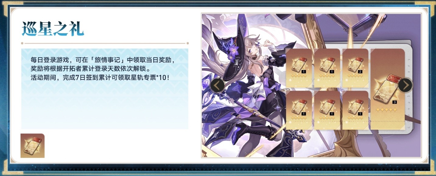 1月15日版本更新后,不仅有签到7天获取的10张「星轨专票」以外,还可额外获得迷迷为开拓者一次性带来的「星轨专票」*10和「变量骰子」。为开拓者前往新星球增添助力。