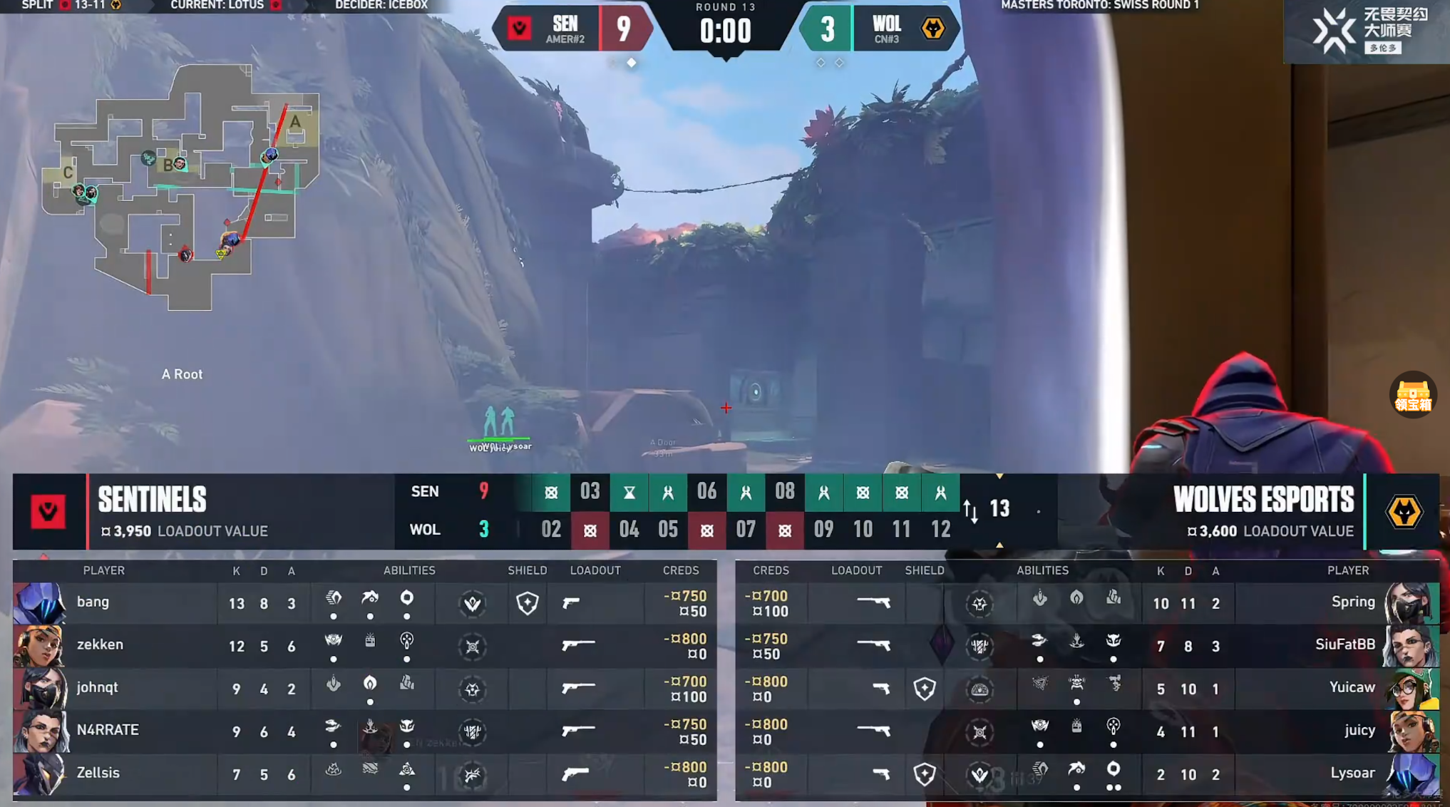 下半场关键的手枪局狼队赢下,狼队追回四分,第18回合狼队在A点出现失误被SEN抓到顺势赢下,第19回合SEN明牌打C,juicy在点内直架一波三杀强势守点拿下。第20回合SEN利用技能打C拿下,狼队回防没有反制的机会被SEN拿到赛点,第21回合SEN来回转点,最终通过夹B赢下,SEN 13-8赢下莲华古城。