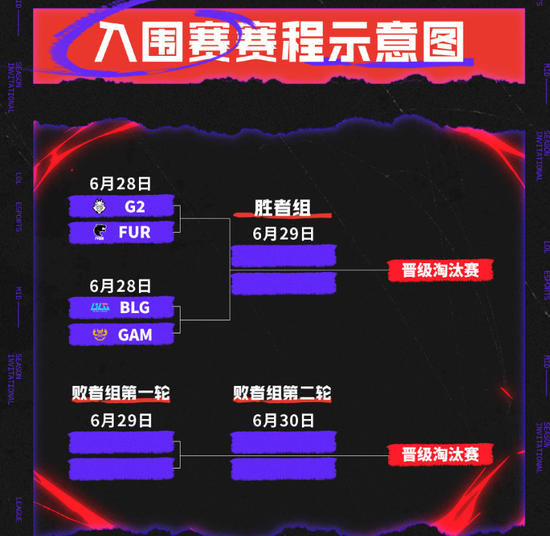 6月28日-30日为入围赛阶段,来自LPL、LEC、LCP赛区的二号种子以及LTA南部的代表队伍将一较高下。获得两场胜利的两支队伍将成功晋级,与剩余的6支队伍在淘汰赛汇合。