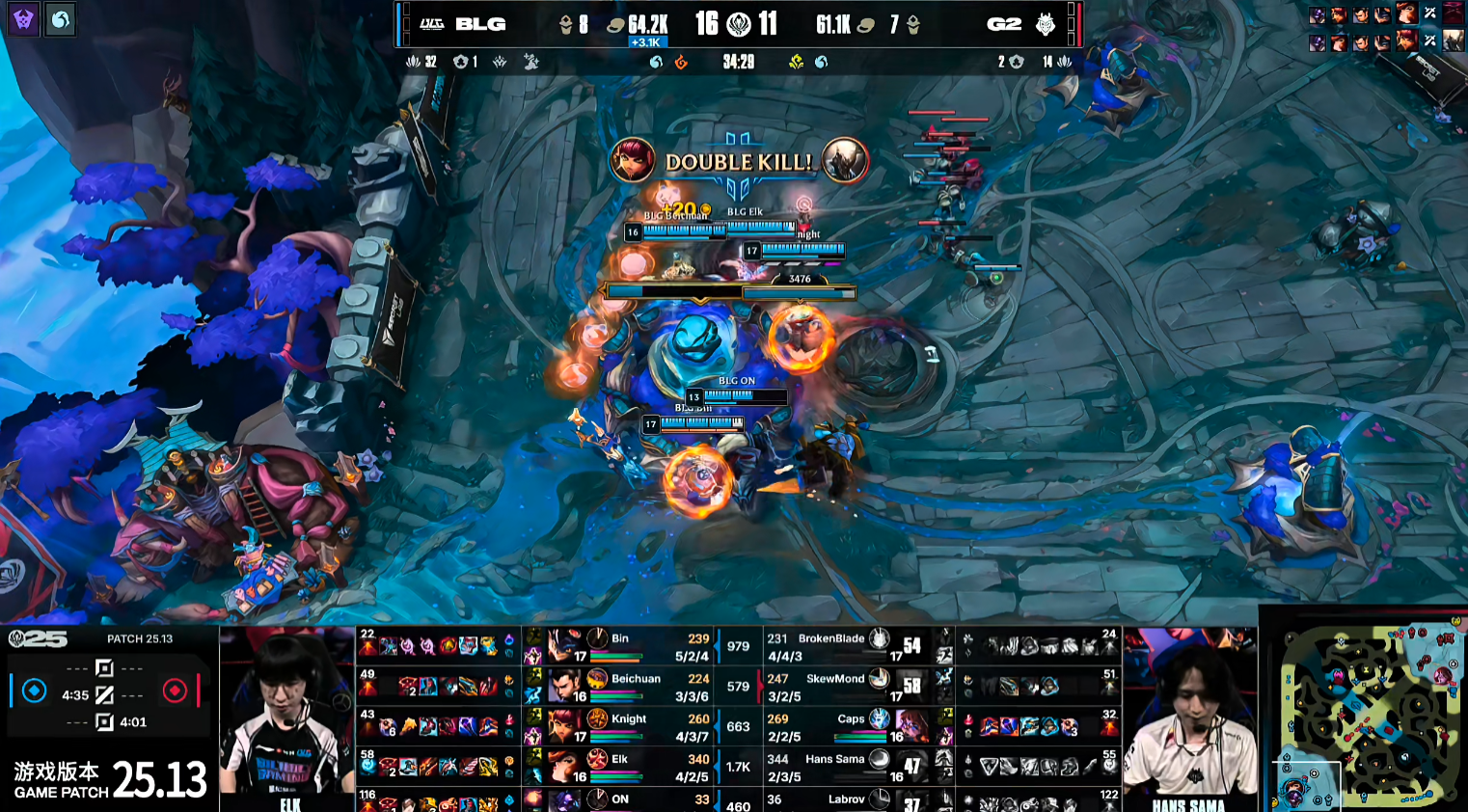 打到23分钟BLG快速rush掉厄塔汗,随后28分钟ON牛头在中路开团配合Elk女枪扫大,BLG团战大获全胜将G2四人击杀,BLG顺势控下大龙。BLG利用大龙推掉G2一路高地,但之后BLG一直迟迟无法拿下,在33分钟中路团战,又被G2打出1换4,反被G2推掉中路高地,G2四个人选择强拆想要一波,但被BLG众人复活强行守下,BLG的中上直接TP下路选择反一波赢下。