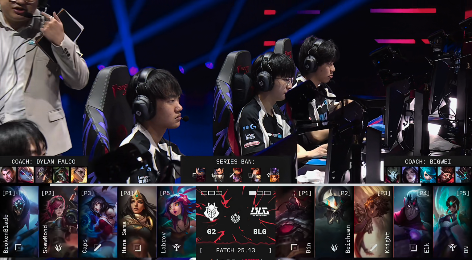 比赛开局3分钟,Knight岩雀单杀Caps阿狸,随后G2的野辅联动Gank中路,BLG的中野被G2抓死。前期对线阶段BLG少占据上风,G2抓人Gank并没有打出效果。结束对线期BLG的转线与推塔节奏开始滚起雪球,BLG在16分钟中路抓死G2的EZ,进一步将视野扩大到G2野区。Bin的塞恩此时已经无人能打动,BLG野区资源也控下三条小龙。