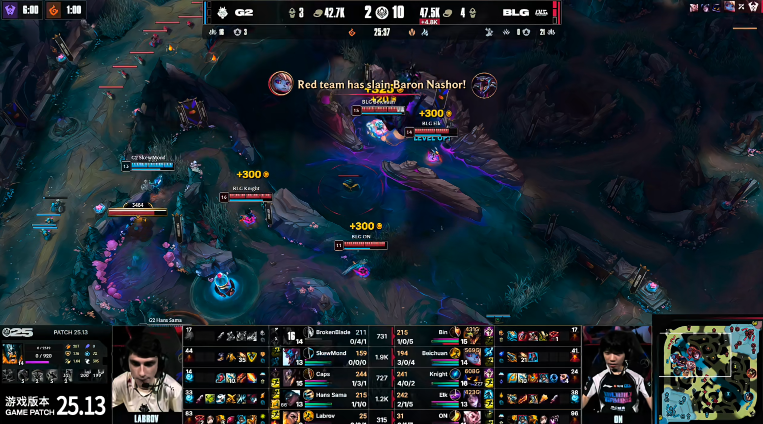 BLG在开局抓到没闪的奥拉夫拿下一血,随后BLG中上野联动再度“军训”G2奥拉夫。比赛14分钟Beichuan与Elk在中路抓死Caps,随后Beichuan与Bin在下路再度将Caps抓死。Caps的卡牌成为BLG的突破口。