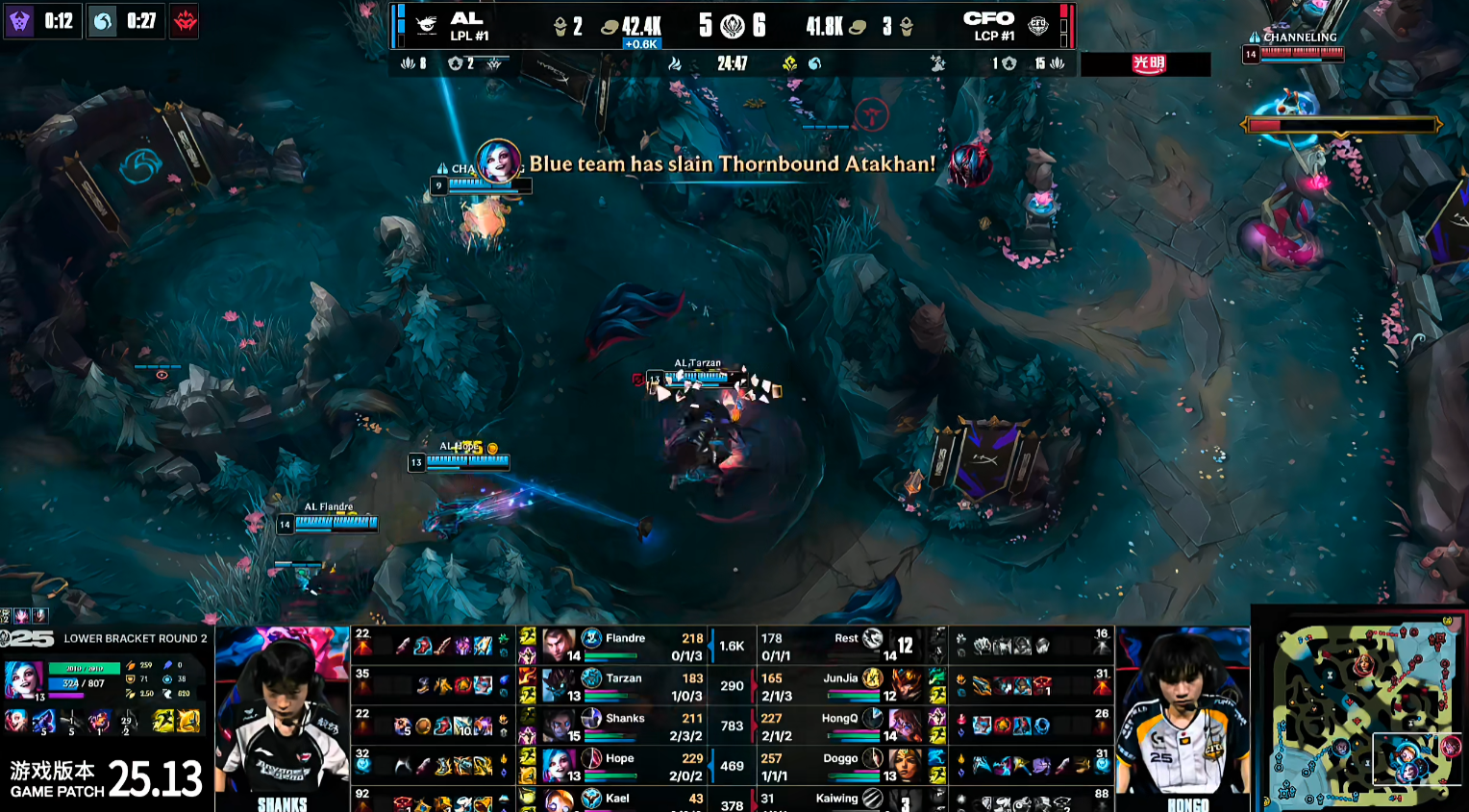 前期对线阶段,AL占据一定优势,成功抱团控下巢虫资源。9分钟,Tarzan操作果断,波比闪现壁咚将CFO辅助牛头击杀,帮助AL拿下一血。12分钟,AL在打出精彩拉扯,击杀CFO打野,逐步扩大节奏。