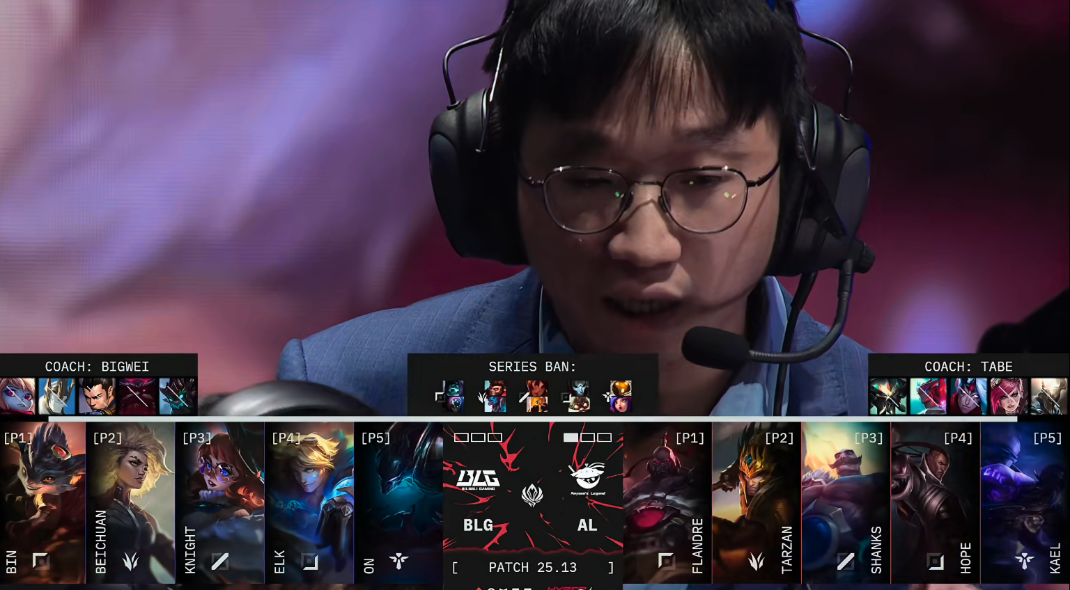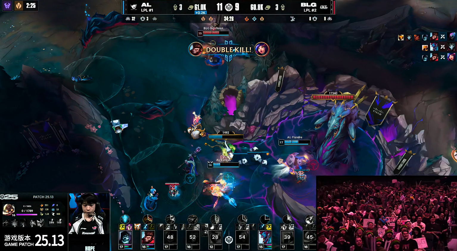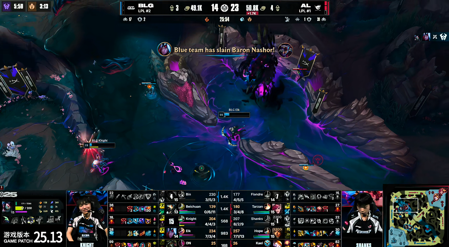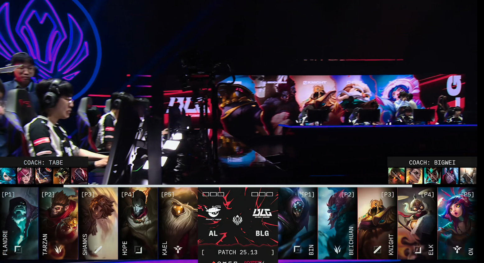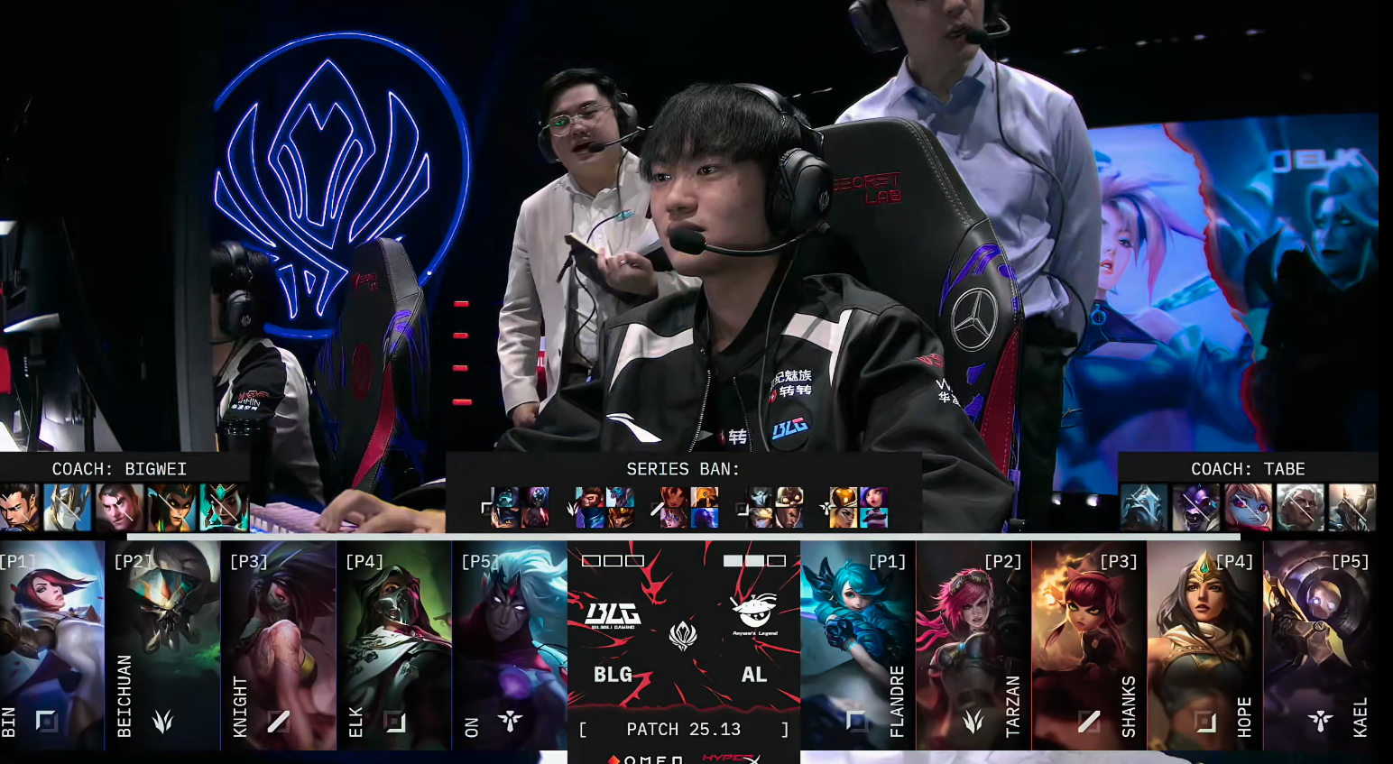 进入中期,BLG开始出现失误节奏。Beichuan连续两波被AL击杀,Elk也在野区与Tarzan换掉。BLG尝试上路五人抱团推进,在推掉上路二塔后想要大打架,却遭遇AL防守反打打出1换4,局势完全扭转20分钟,Kael的机器人关键开团,再度帮助AL打出1换3的团战胜利。