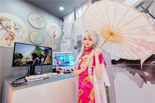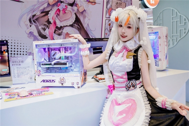 由AORUS B850M主板搭配技嘉破空C201机箱打造的耀白之境展区,萌萌的女仆雕妹忍不住和自己的次元形象近距离合影。就连前TEC.Blackovo也不能抗拒这样萌萌的硬件专区的吸引力。