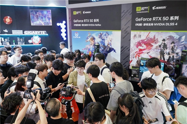 玩家们在NV区体验技嘉RTX 50系顶级显卡,DLSS 4技术加持,在《守望先锋》《鸣潮》游戏中画质细腻,帧率飞升,仿佛置身战场。