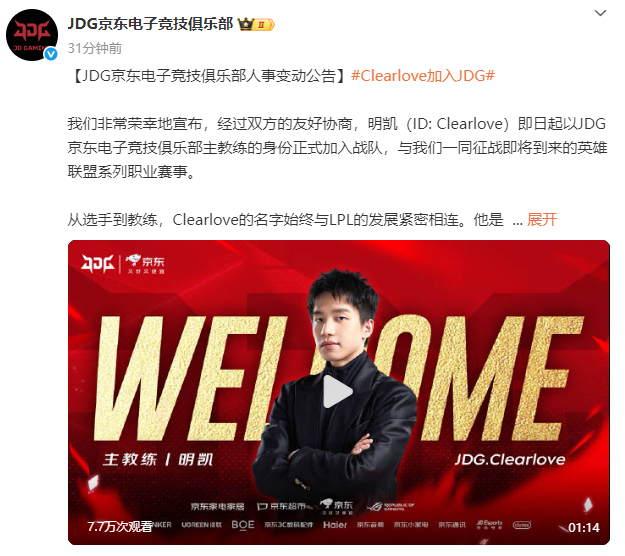 北京时间7月14日,JDG战队正式官宣前EDG功勋人物Clearlove加盟,担任主教练一职。