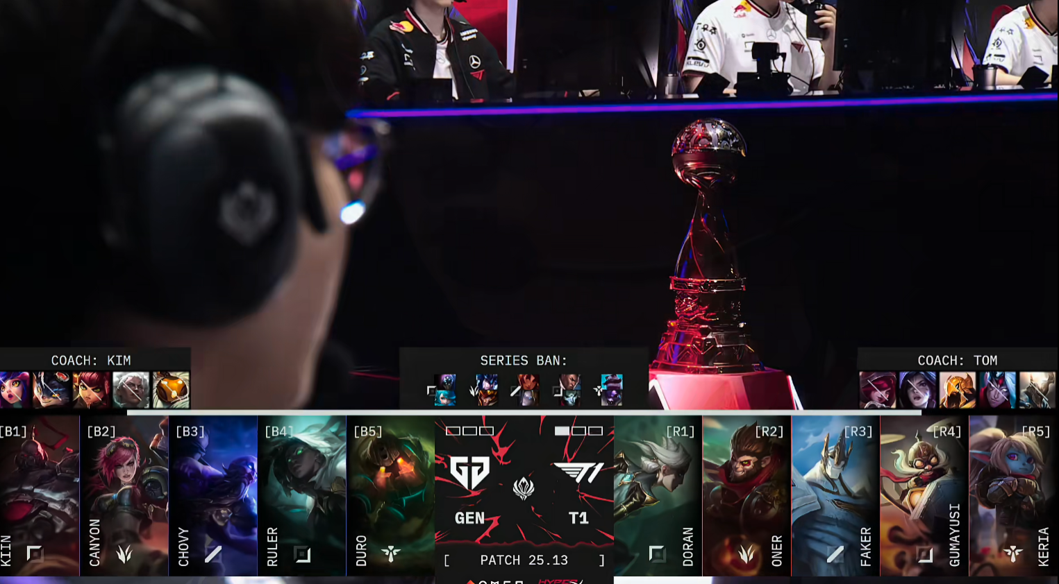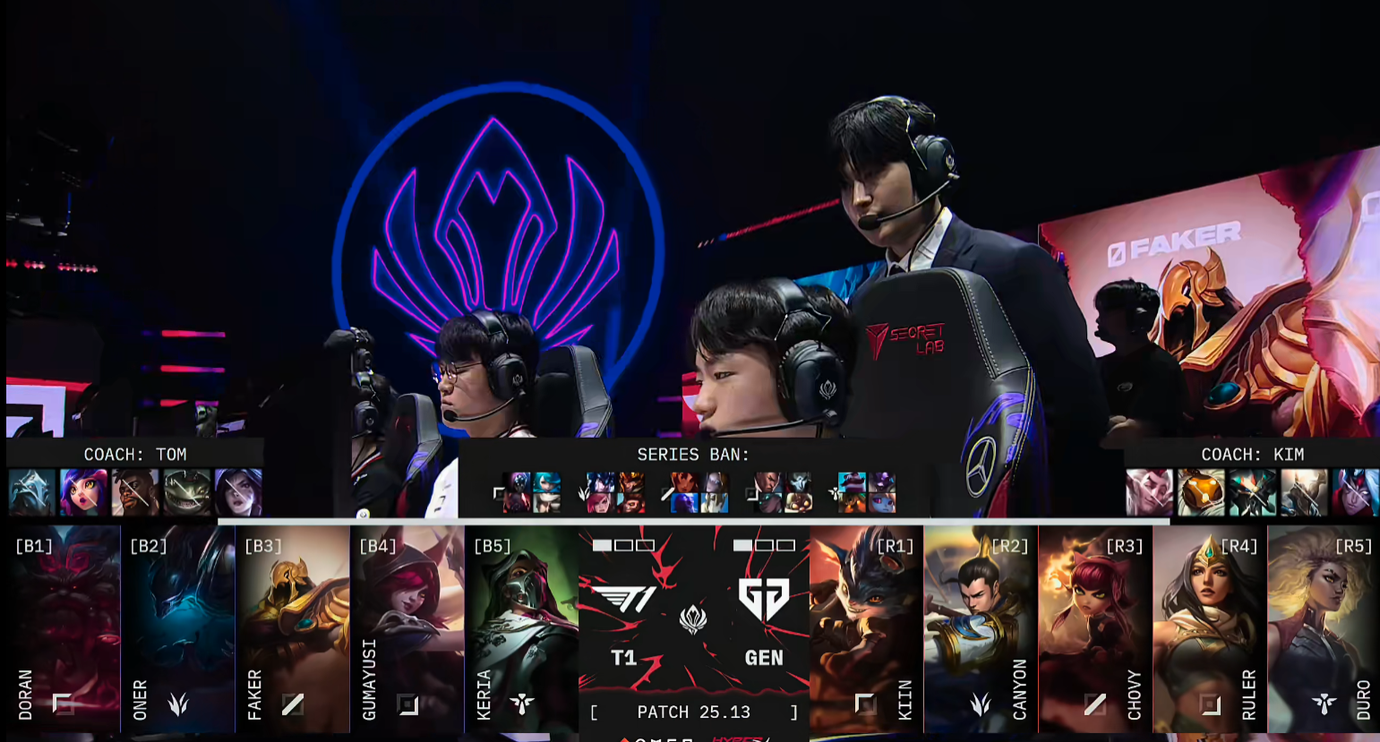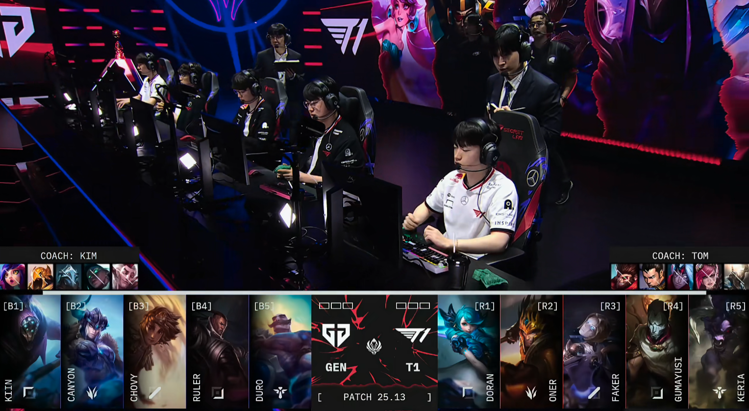 比赛开局,8分钟Kiin赛恩完成单杀,小吕布的飞机惨遭压制。随后T1迅速调动上路资源,抱团抓死GEN下路组,稳住局面。巢虫团中,GEN仍想接团,却被T1打野Oner收掉辅助Duro。15分钟中路爆发团战,T1合力将Canyon击杀,但Doran回城时被GEN发现击杀,双方打出1换1,GEN趁势控下峡谷先锋。紧接着Doran在边线再次被抓,T1失去争夺小龙的能力,GEN稳稳拿下小龙。