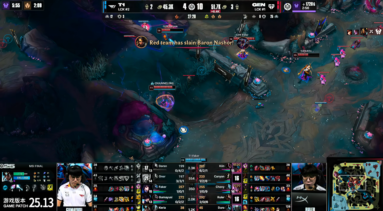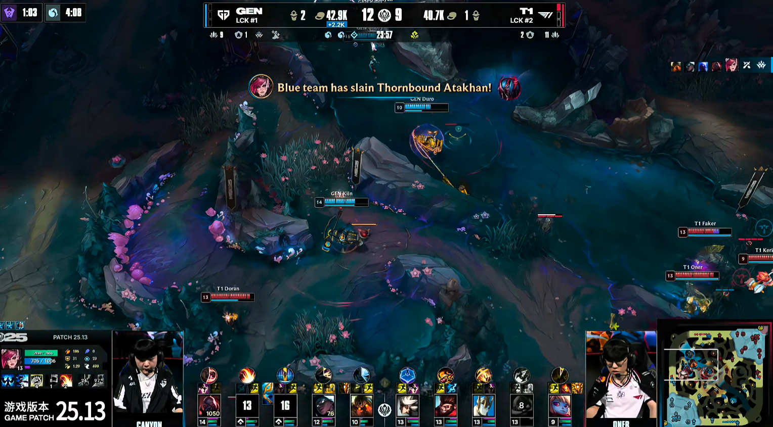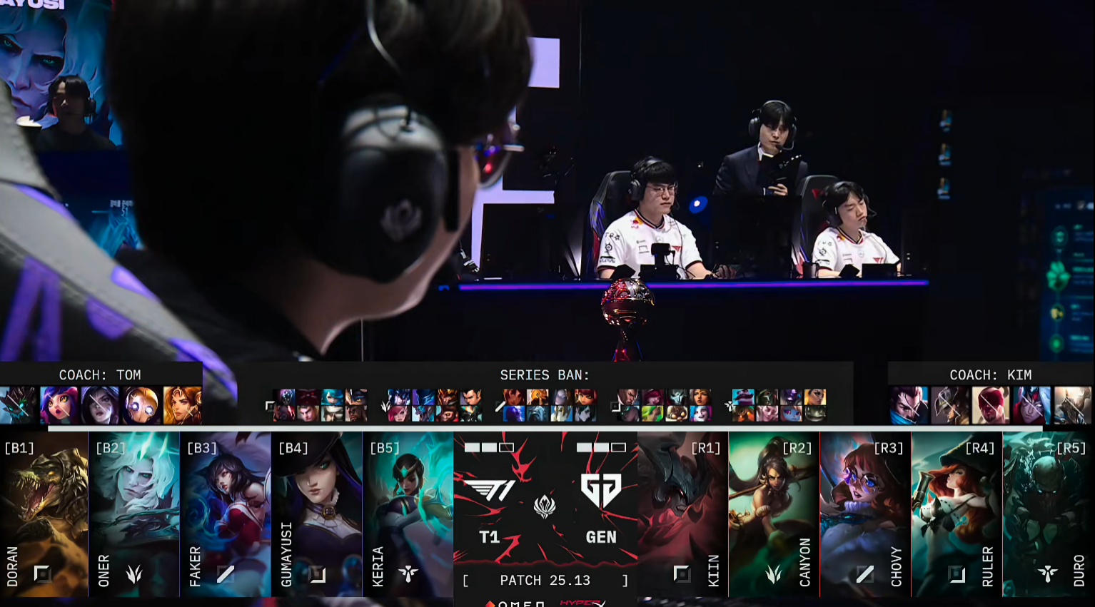 比赛开局,8分钟Kiin赛恩完成单杀,小吕布的飞机惨遭压制。随后T1迅速调动上路资源,抱团抓死GEN下路组,稳住局面。巢虫团中,GEN仍想接团,却被T1打野Oner收掉辅助Duro。15分钟中路爆发团战,T1合力将Canyon击杀,但Doran回城时被GEN发现击杀,双方打出1换1,GEN趁势控下峡谷先锋。紧接着Doran在边线再次被抓,T1失去争夺小龙的能力,GEN稳稳拿下小龙。