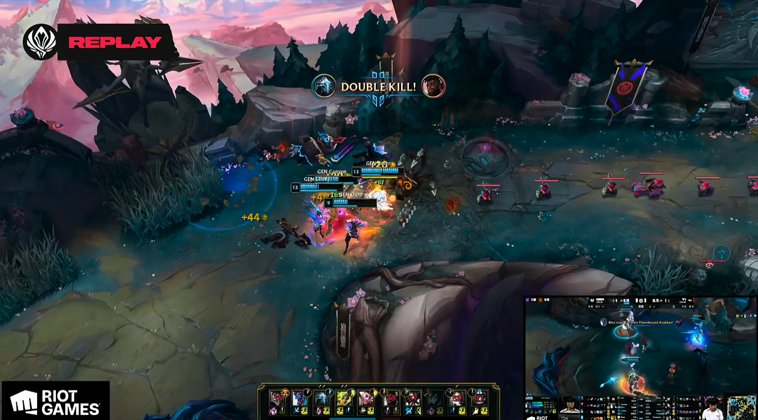 15分钟的河道团战中,GEN再度发力,Ruler成功击杀Keria,双方你来我往互有攻守。比赛来到21分钟,GEN在上路前后夹击T1,打出关键的1换4团战,并控下厄塔汗,GEN场面全面领先。