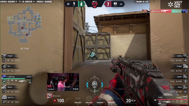 换边以后BLG的气势依然非常充足,连续拿下手枪局和经济局,来到长枪局以后他们依然强势,抓到侧身和架点打掉TE三人,迫使TE选择保枪。在通过最后一个暂停调整以后,Kai扛起责任正义精准连杀帮助TE止住了连败,TE顽强追分完成反超,一鼓作气拿下11分接近了赛点,BLG强攻A区开启蝰腹以后总算是摧毁了TE的防线。第22回合TE凭借冥驹压制住BLG的进攻意图,拖干了时间拿到赛点。BLG吸取教训提速爆弹,顶住压力连拿两分,双方战成12:12,比赛进入加时赛!