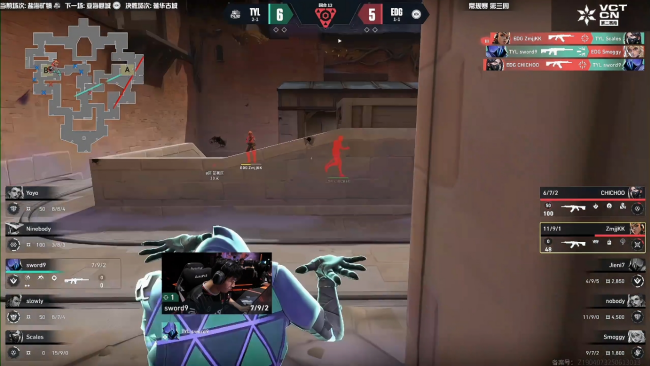 下半场的前两分被TYL拿到,双方又回到平手状态,关键的长枪局TYL从中路推进,把EDG的防守逐个击破,CHICHOO尽力接到两人但没能改变结局,Ninebody赢下与Smoggy的残局帮助TYL在下半场开局建立了很大的经济优势。但EDG立刻向TYL展现了自己的强横肌肉,双方在中路一波激烈拼抢,经济局的EDG瞬间打掉TYL四人完成ECO翻盘。节奏重新回到EDG的掌控之中,Jieni7今天的状态越来越火热,又是一波三杀接管战局,打出了TYL的第一个暂停。TYL想要利用大招追分,但nobody发现了Scales暴露在蝰腹边缘的枪管完成击杀,EDG拿到赛点以后在赛点局主动从B区出击,瞬间刷屏击溃了TYL,2:0带走了今天的胜利!