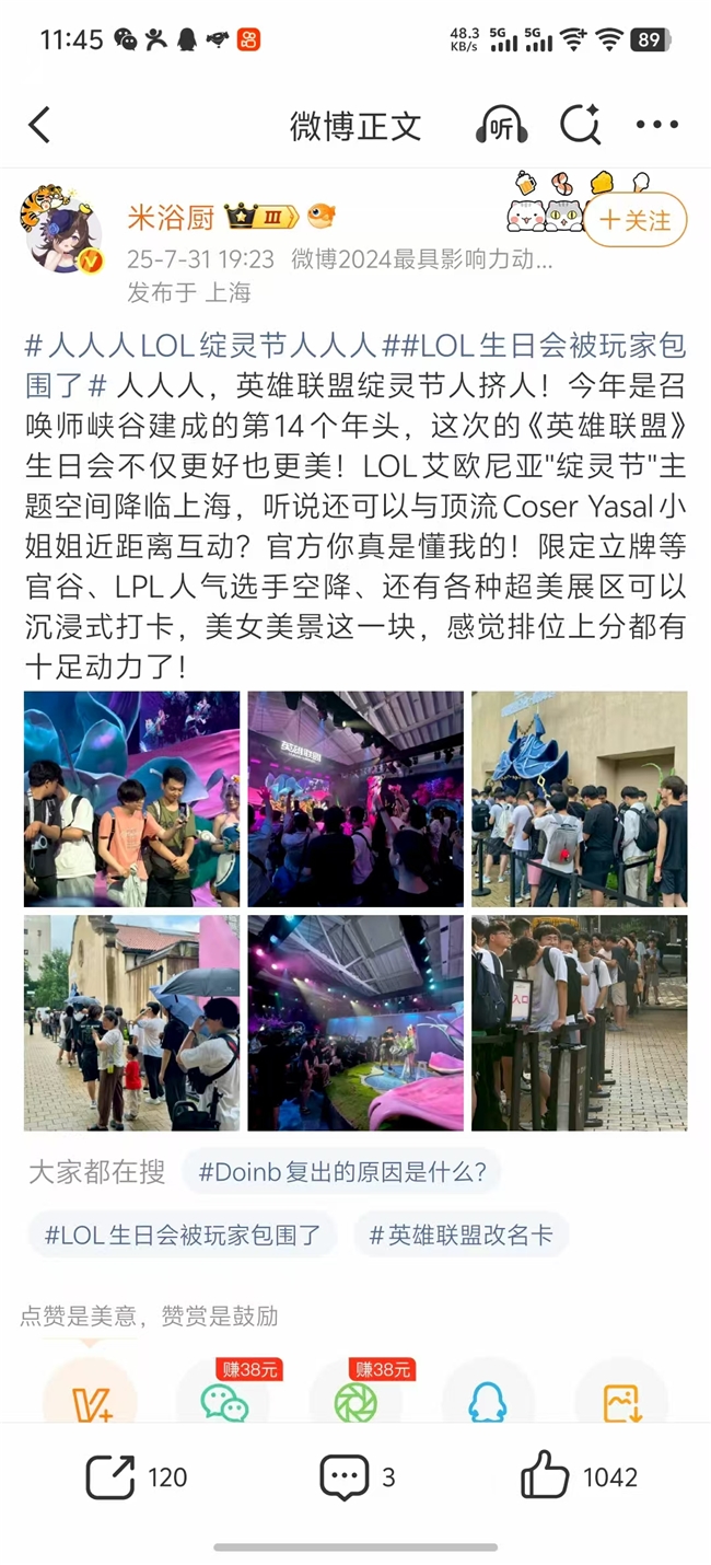 从现场其他老哥的反馈来看,不止是小编自己,大家作为英雄联盟玩家的都对这次生日会期间的各种细节拿捏十分认可。从入场时的莫甘娜雕像,到疗愈温泉的Coser小姐姐合影,再到各种场限谷子免费解锁,大家不仅玩的十分开心,同时也是收获满满,都在社交平台上纷纷发表自己活动后的感想。