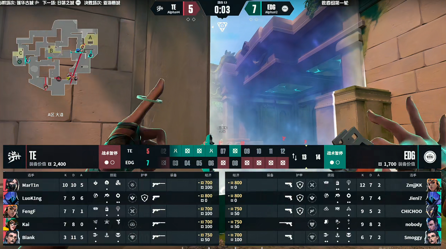 上半场EDG赢下手枪局并打出四连胜,第5回合EDG提速B点,被FengF打掉两个,TE其他四人回防打掉EDG赢下首分。TE连拿五分,第10回合EDG终于拿到第五分,第11回合EDG提速B点交出铁臂与猎枭两个大招,TE回防寻敌箭拿到信息将EDG迅速打掉,TE连下两分,以7-5结束上半场。