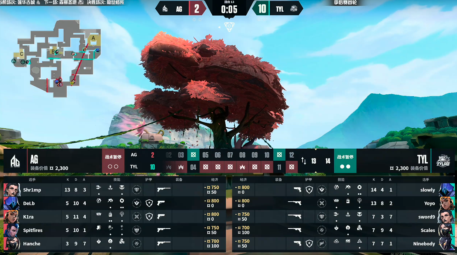 下半场天禄赢下手枪局,AG第14回合强起抢分,AG抱团打掉天禄C点的防守赢下。第15回合天禄在AB两点直接前压打掉AG完成翻盘。第16回合赛点局,天禄放点打回防,通过Scales一波四杀带队赢下,TYL 13-3赢下莲华古城。