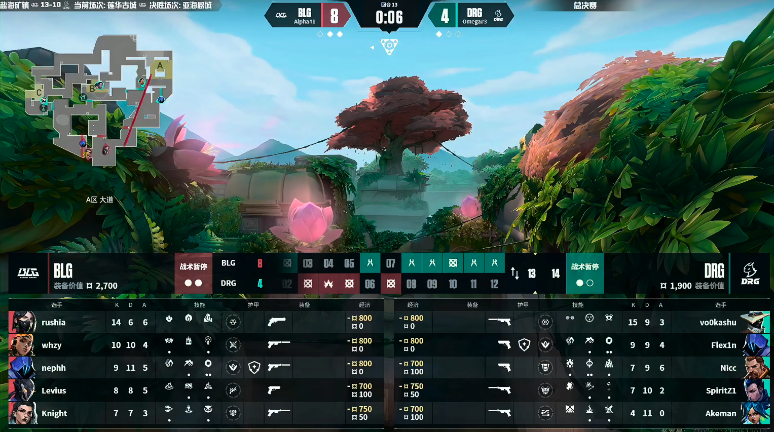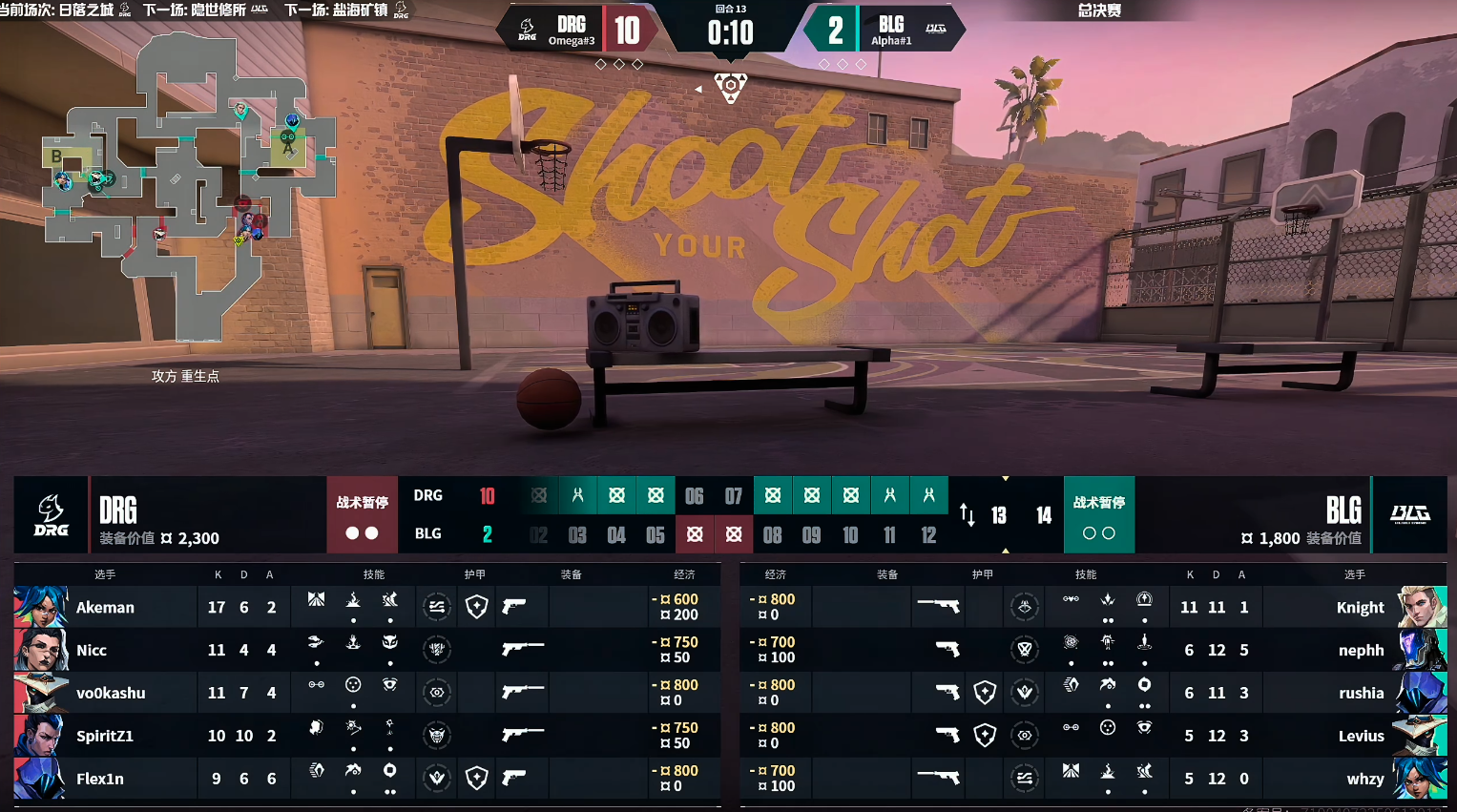 下半场DRG赢下手枪局后拿到赛点,第15回合BLG来到长枪局,DRG夹击B点,直接一波带走BLG,DRG 13-2赢下图一的胜利。