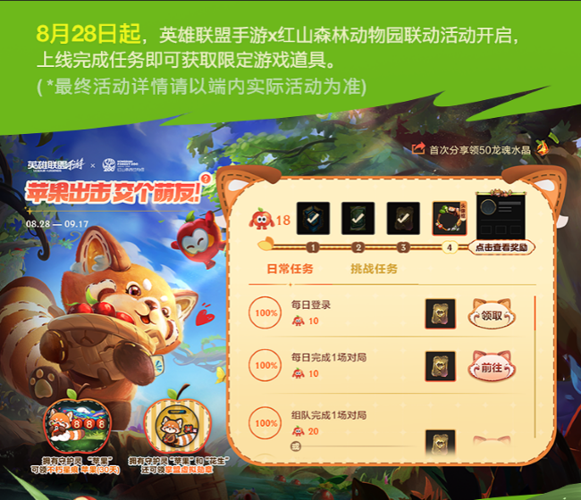 8.28 - 9.17“苹果出击,交个萌友”活动正式上线英雄联盟手游端内,玩家可通过完成日常任务与挑战任务累积苹果值,苹果值到达一定里程碑即可解锁相应奖励!