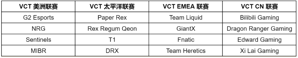 从VCT CN 联赛、VCT 美洲联赛、VCT EMEA 联赛和 VCT 太平洋联赛到全球赛事,最出色的十六支队伍晋级无畏契约冠军巡回赛的最终赛场。其中: