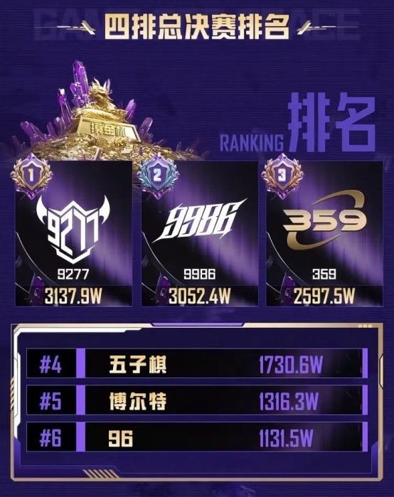 和冠军相比,亚军和季军的夺奖之路同样不容易。9986战队在决赛上半场仅有20万收益的情况下,下半场奋起直追,扫下大半个辐射区物资的情况下还开出一张幸运黑卡,全队发挥默契拿下12个淘汰,最终从榜末逆袭获得亚军;359战队小组赛以第一名杀出重围,半决赛上半场位列倒一且收益差极大,下半场逆天改命团灭三队成功晋级,并在总决赛中稳扎稳打顺利拿下季军。