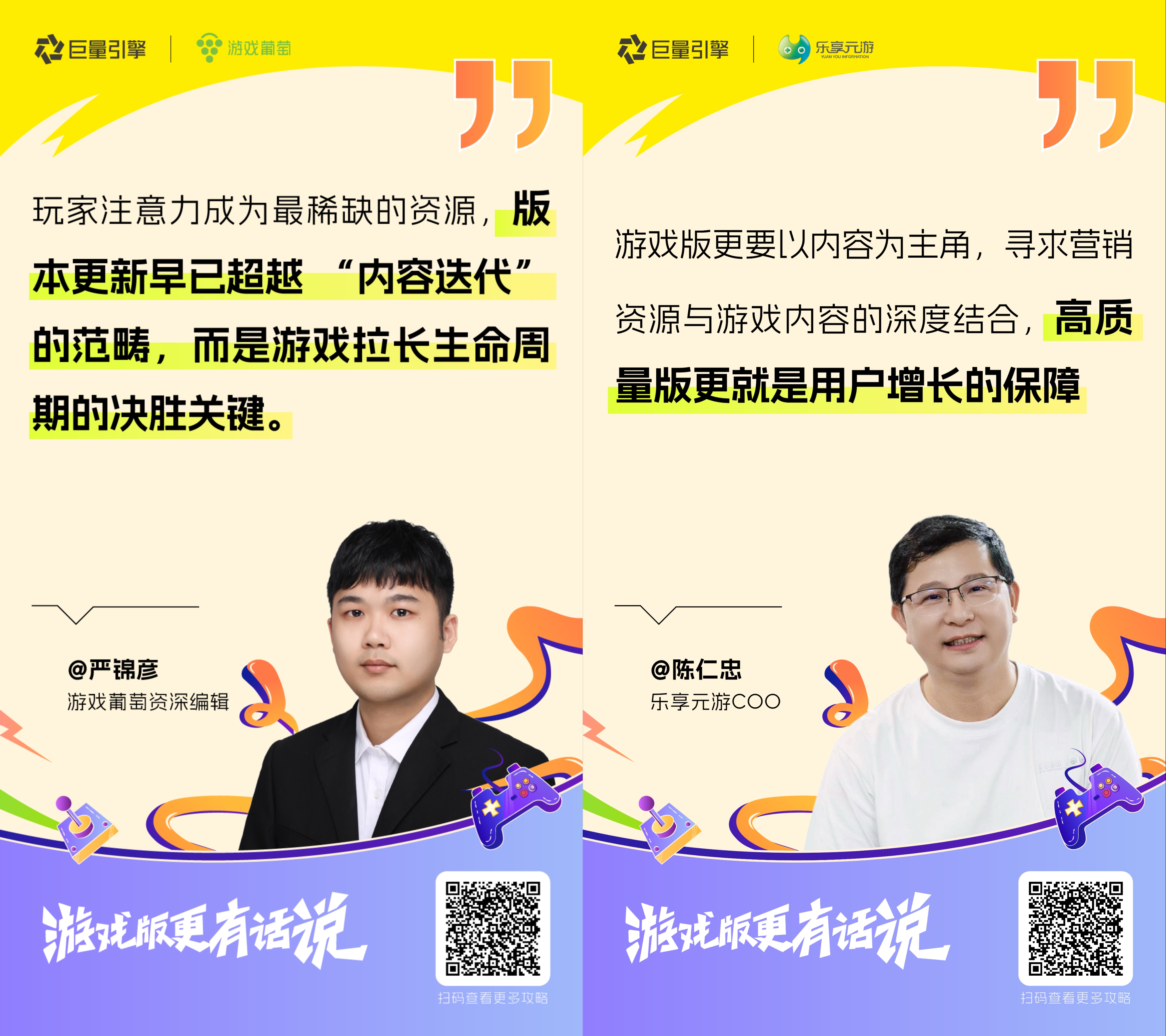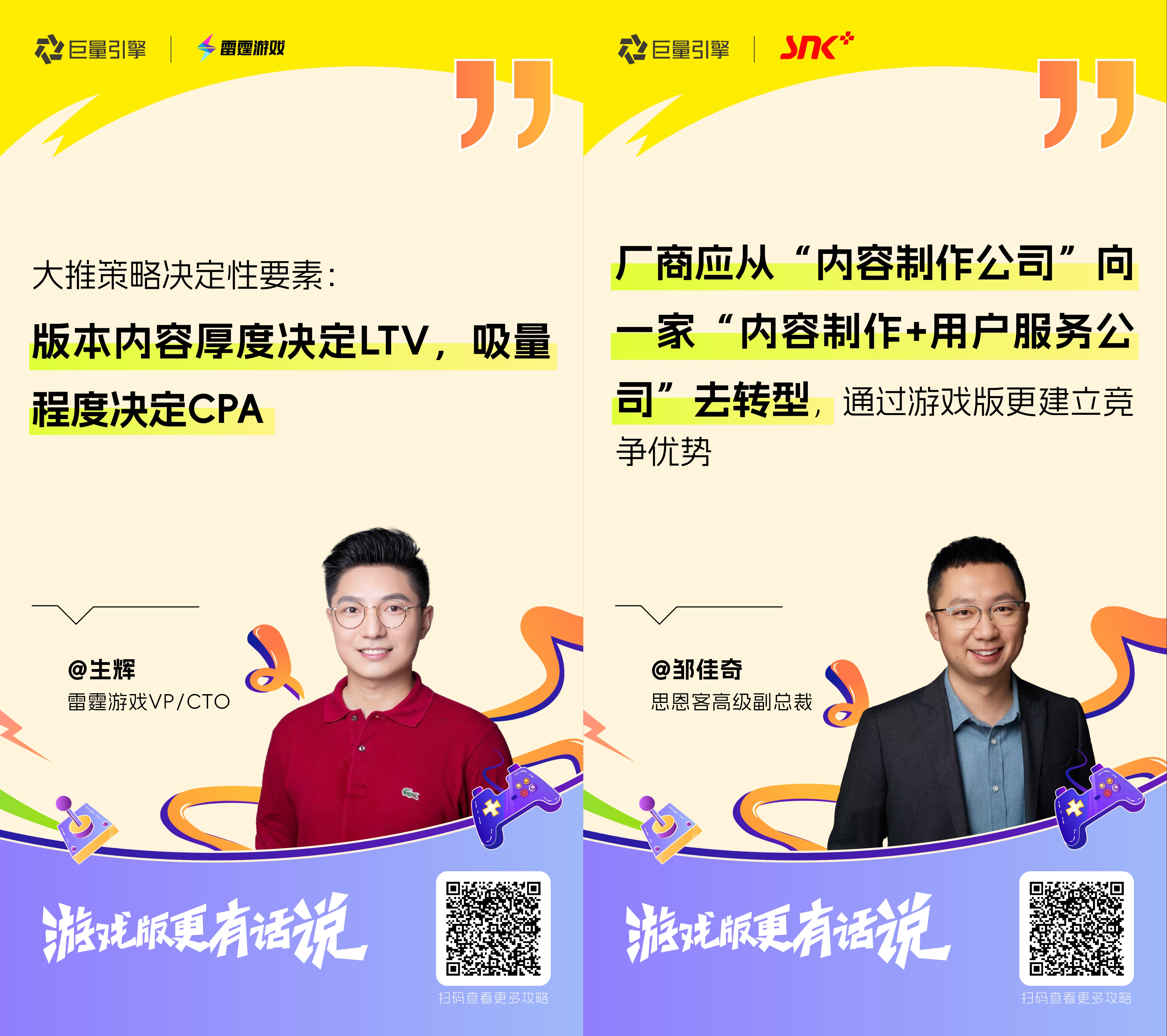 版更即增长的大势所趋下,游戏厂商如何借力版更大推“破圈促收”?近日,巨量引擎联合游戏媒体游戏葡萄共同打造《游戏版更有话说》深度对谈,特邀游戏葡萄资深编辑 严锦彦 、雷霆游戏VP / CTO 生辉,乐享元游COO 陈仁忠,思恩客高级副总裁 邹佳奇,与平台共同探讨“游戏版更大推,助力破圈增长”。