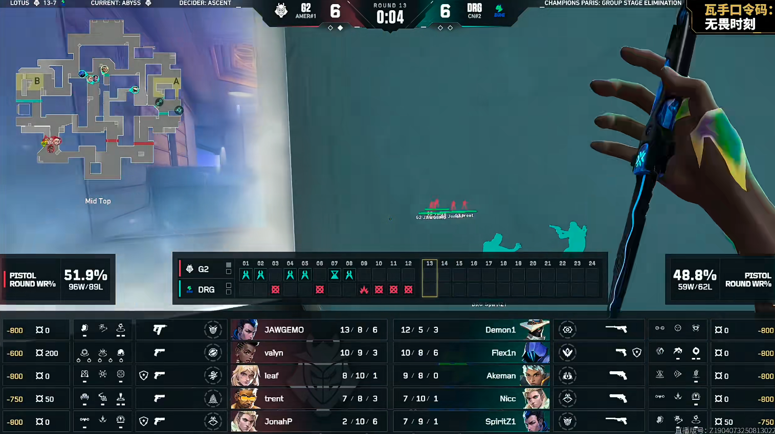 上半场G2赢下手枪局拿到四分。第6回合DRG打B拿下,这分Demon1三杀带队拿下。第9回合DRG在A点前顶,打掉G2四人顶住回防,DRG完成一个ECO翻盘。在第二个暂停调整后,DRG起势得分,DRG一口气打出四连胜,将比分成功追平。上半场双方比分6-6。