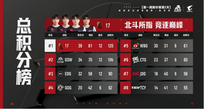 首日赛后,GSW凭借着59的总积分暂居第一,随后是17战队和PeRo战队,战神榜第一名则是给到了PeRo战队的Aixleft。