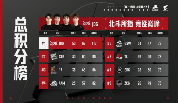 比赛第一天,JDG继续发力,拿下首场胜利。特别是最后SMS开着装甲车过来嘲讽的名场面,让人哭笑不得,但最后还是被JDG拿下胜利。而在接下来的几场中,17战队可谓是意气风发,几乎每一场都冲进了TOP4中,其中还有两把吃鸡,拿到了大量的得分点,不出意外,首日赛事结束后,17战队站在了第2名,仅随JDG之后。