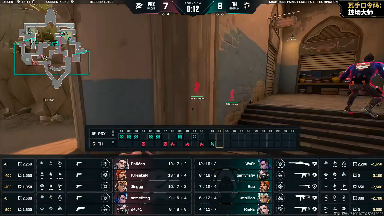 下半场PRX的连胜还在继续,PRX赢下手枪局,TH的奖励分也被大fo打赢残局拿下。PRX在图三莲华古城打出十二连胜一举拿下,PRX晋级冠军赛四强。
