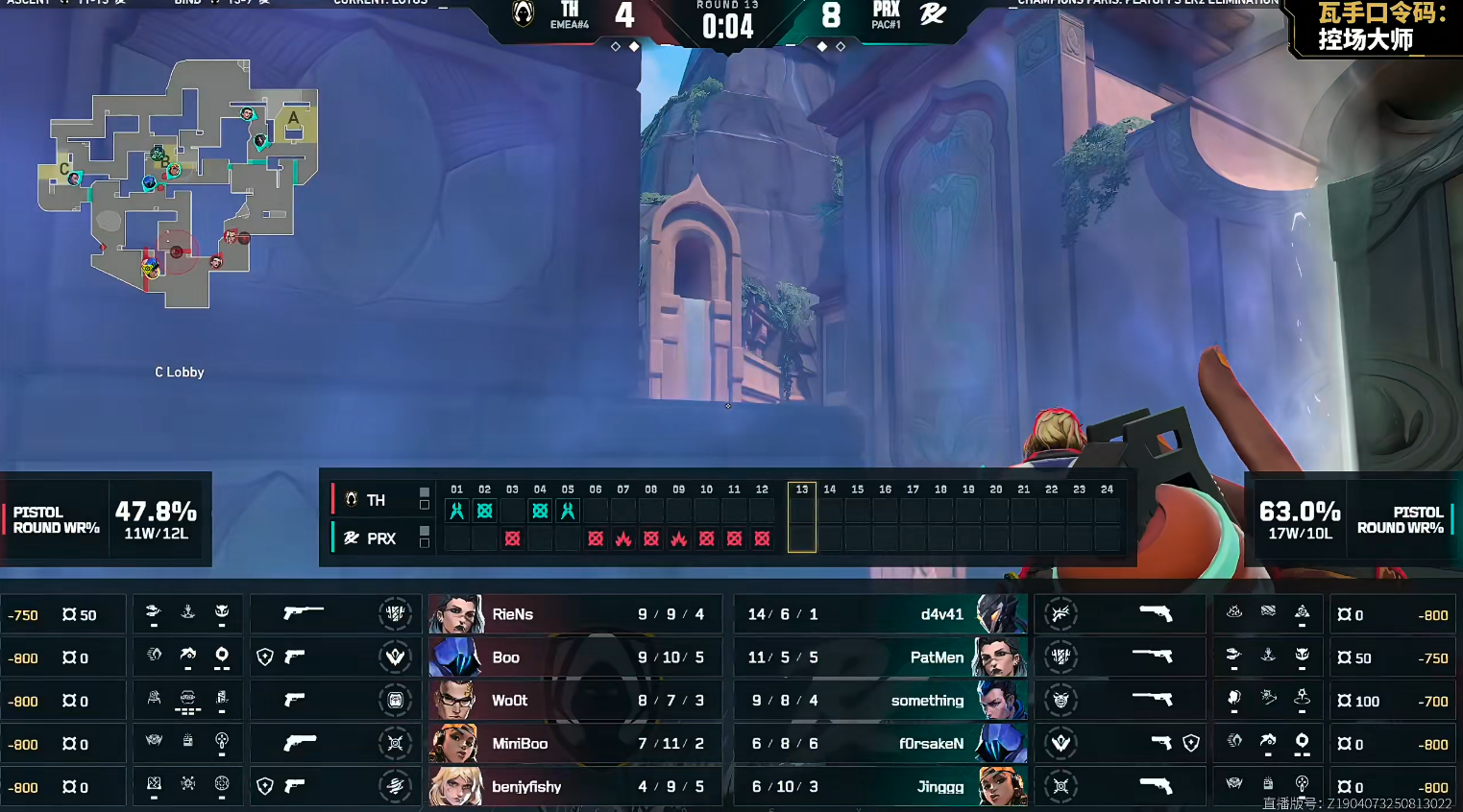 上半场TH赢下手枪分,第4回合的长枪对决,miniboo三杀守住AB连。第6回合PRX黑梦与维斯两个终极技能打A拿下第2分。PRX的暂停调整有效,并打出七连胜,而TH接连丢分,暂停调整之后依旧未能守住PRX的进攻。上半场PRX 8-4 TH。