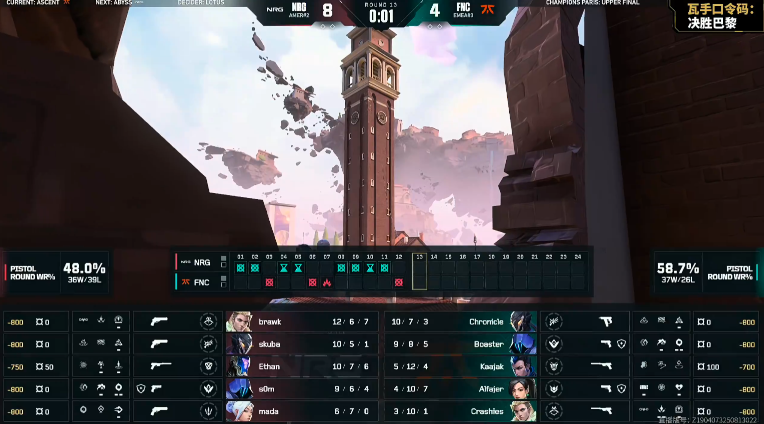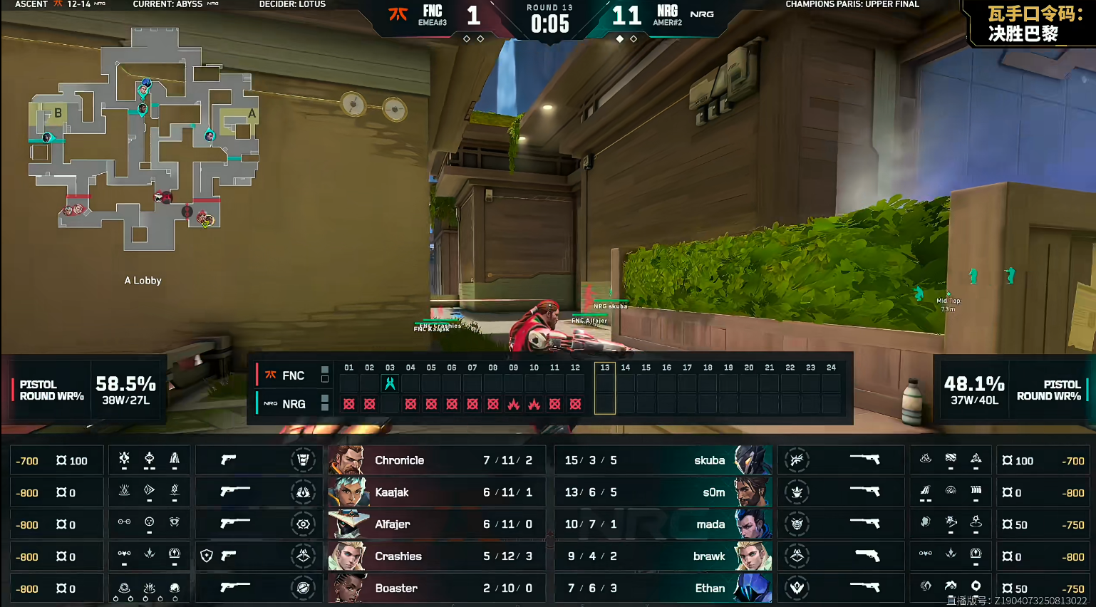 上半场skuba开局四杀,NRG赢下手枪分。第4回合FNC在A点选择硬刚NRG的技能道具,但最终还是被NRG给打掉赢下。NRG统治上半场,只让FNC赢下奖励分,并打出九连胜,上半场拿到11分。