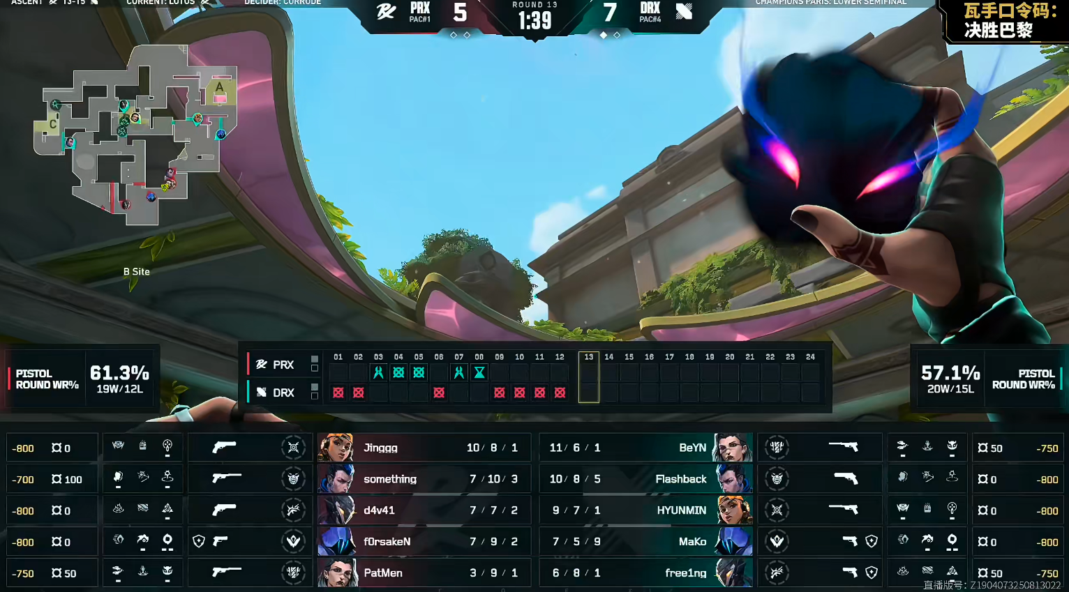 下半场DRX赢下手枪分,HYUNMIN第14回合戍卫连点四个,第15回合PRX用三把长枪的代价打B赢下。DRX打出五连胜将比分打平。第21回合PRX孤注一掷交出三个大招打B赢下。PRX连下两分拿到赛点,第23回合DRX架住中路过点,将PRX的进攻全部打掉,DRX连下两分将比赛打到加时。加时赛打到第二轮,DRX进攻边,A大对枪打赢进A直接赢下。换边之后DRX快速回防根本不给PRX任何机会,DRX 15-13赢下图一。