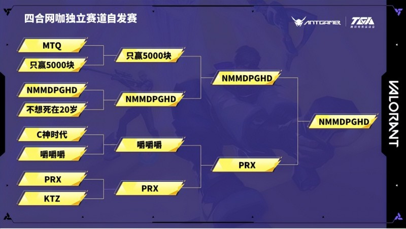 四合网咖凭借全国300家门店布局与丰富赛事经验,是本次TAG无畏契约ANTGAMER全国挑战赛的独立赛道的重要一环。其专属赛道以“直通全国八强”的福利吸引大量草根战队,经过层层筛选,8支劲旅脱颖而出,于9月7日会师决赛争夺晋级资格,这八支队伍分别是宁波鄞州店的“嚼嚼嚼战队”,宁波联盛广场店的“不想死在20岁战队”、绍兴柯桥万达店的“只赢5000块战队”、临海靖江中路店的“MTQ战队”、台州椒江现代天地店的“ktz战队”、湖州安吉万象店的“PRX战队”、杭州湾世纪金源店的“c神时代战队”、海宁银泰城店的“nmmdpghd战队”。