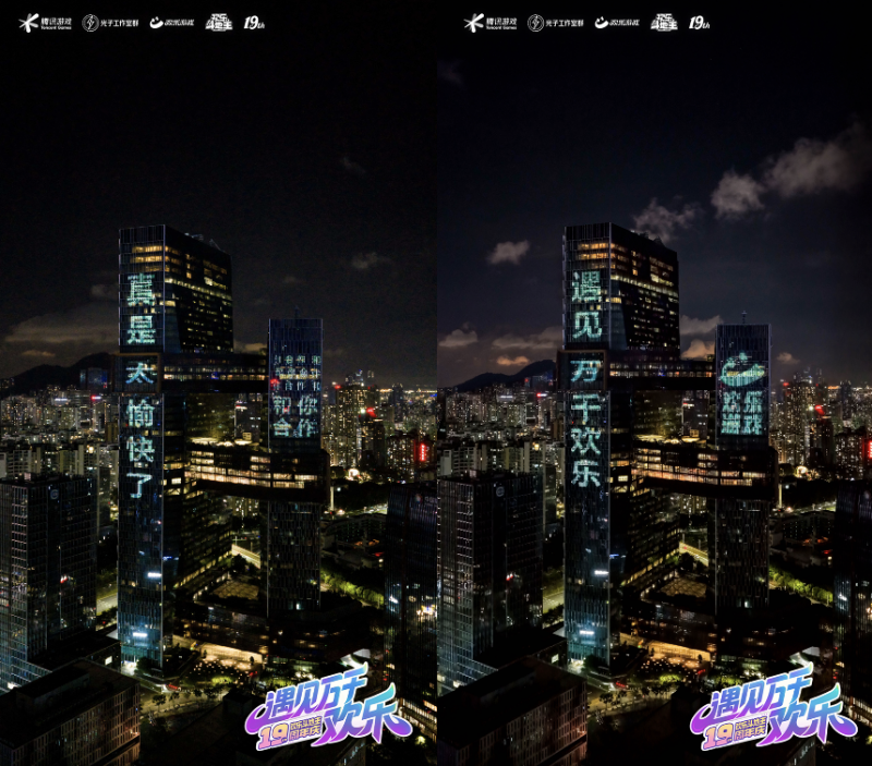 更亮眼的是,官方直接在腾讯滨海大厦来了波“高调”官宣,大厦前立起巨型的“地主抱欢乐豆”气模,夜晚更是有“欢乐斗地主,遇见万千欢乐”以及各种经典“游戏黑话”灯光秀,仪式感直接拉满。无数玩家也前来打卡拍照,这排面简直绝了!