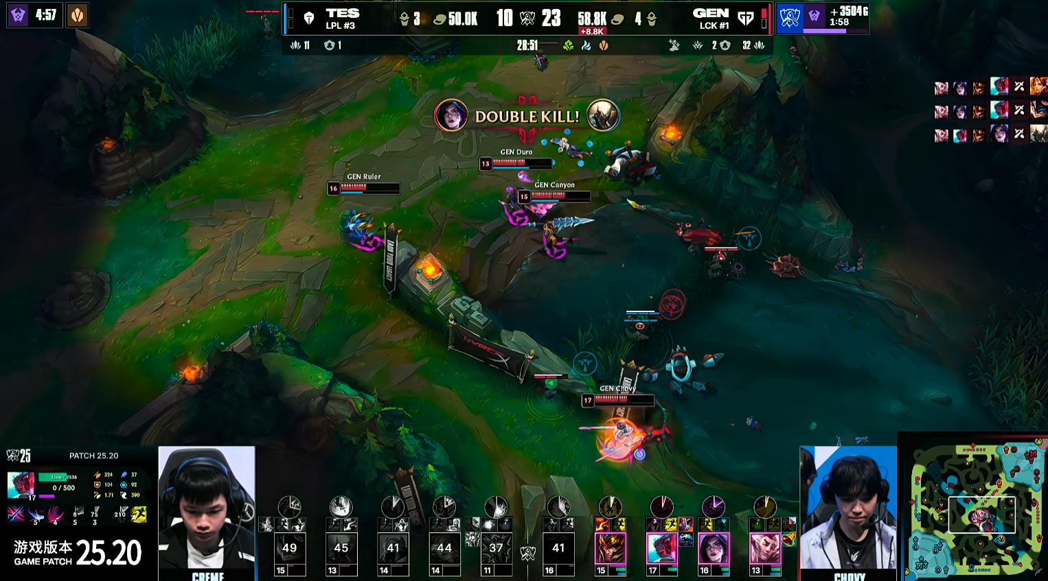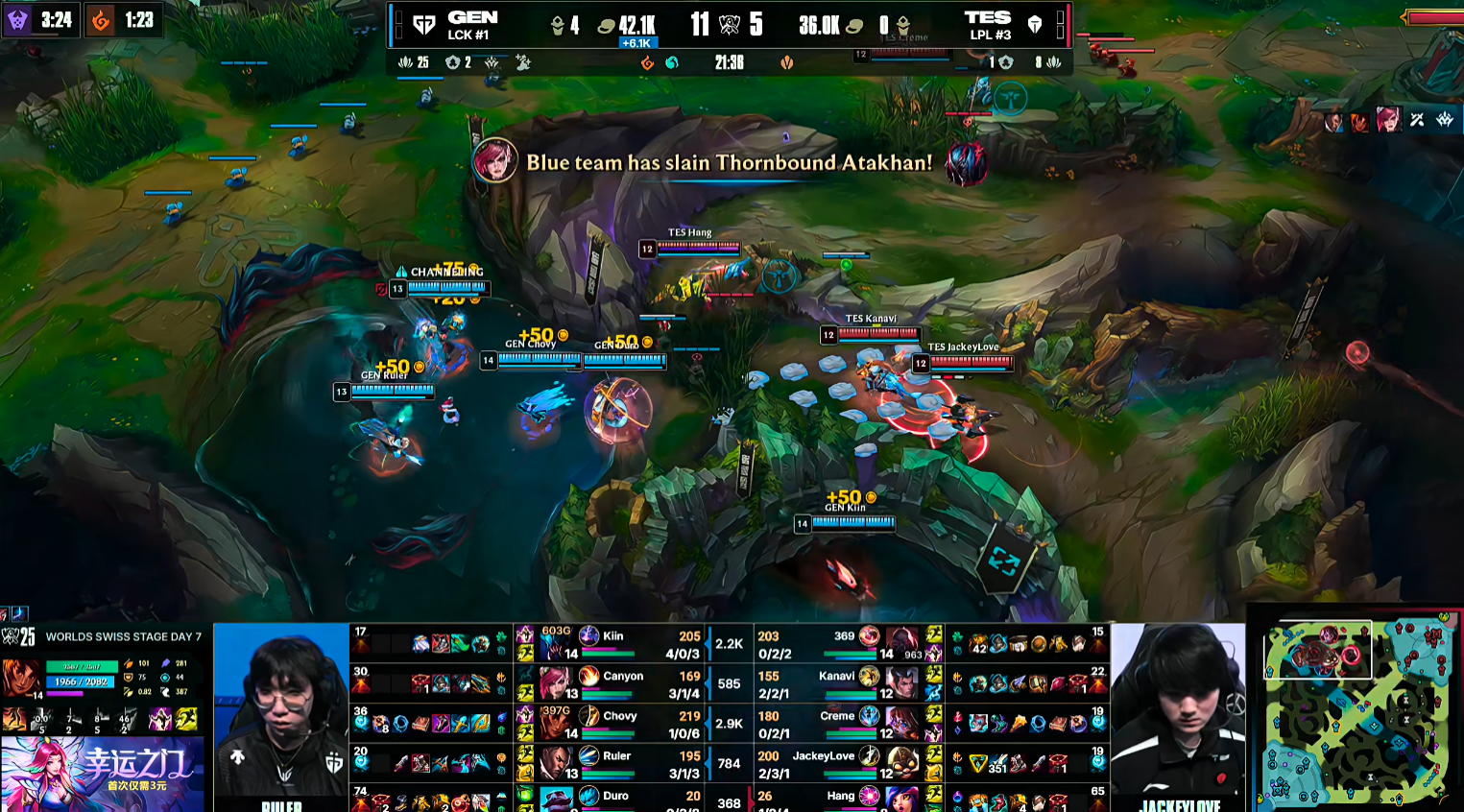 比赛15分钟GEN控下先锋,直接撞掉TES的中路一塔,Chovy岩雀抬到小奶油阿萝拉,GEN一波团战打出0换4,GEN大赚并推掉TES中路二塔。虽然Hang打出一波完美开团,但TES缺伤害没能打出人数差,还是被GEN运营给逐步滚起雪球。21分钟GEN利用TES众人回家的timing快速打掉厄塔汗,GEN将降级差拉开到1W,GEN在24分钟下路团灭TES直接一波轻松平推赢下比赛。