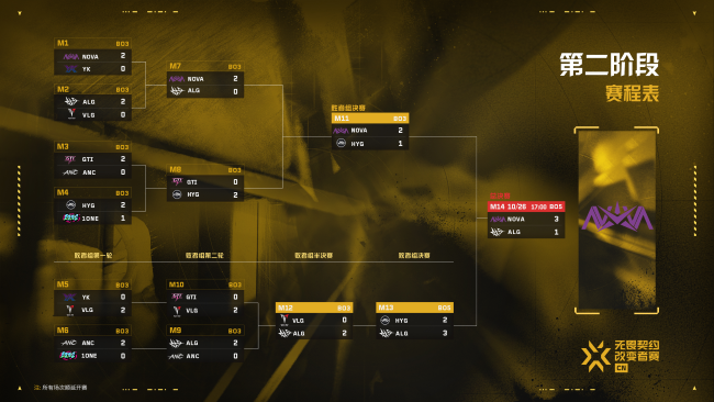 本次2025改变者赛CN赛区资格赛第二阶段,在第一阶段名次靠前获得直邀参赛资格的四支队伍(NOVA、ALG、YK、HYG)和海选阶段脱颖而出的四支队伍(VLG、1ONE、ANC、GTI)等8只队伍间展开。经过10月5日至10月9日五天线上的单败淘汰赛比拼,NOVA、HYG、VLG、ALG四支队伍进入2025改变者赛CN赛区资格赛第二阶段线下阶段(10月24日至10月26日),向冠军和晋级2025改变者全球冠军赛的名额发起冲击。