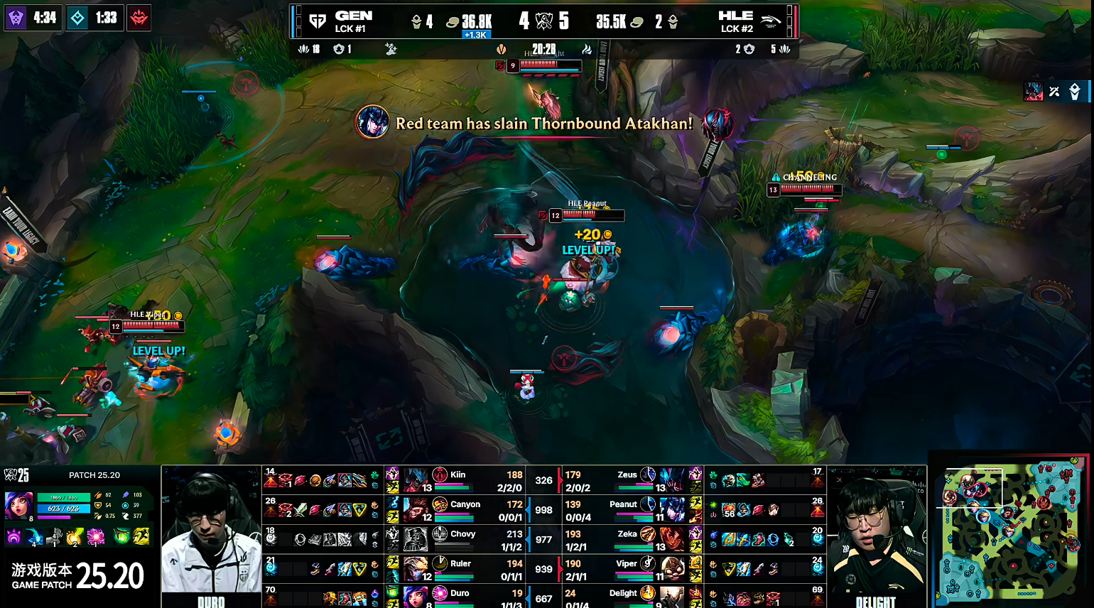 前期6分钟小龙争夺,HLE率先落位,GEN虽然也赶到,但他们这个时间点没有伤害,被HLE追着打并拿下小龙。随后巢虫团,GEN将小花生与Delight击杀,人头让Ruler拿到,GEN控下三条虫子。15分钟先锋刷新,GEN拿到先锋双方战成一团,HLE打出1换4。