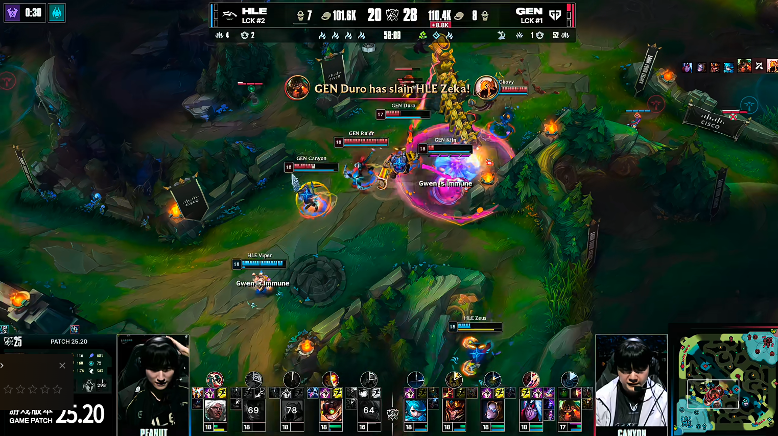 双方打到57分钟,GEN在中路主动开团,HLE三人阵亡,GEN直接中路推进去,两路兵线上高,HLE的吉格斯与安蓓萨根本受不住,GEN成功鏖战58分钟赢下比赛的胜利。