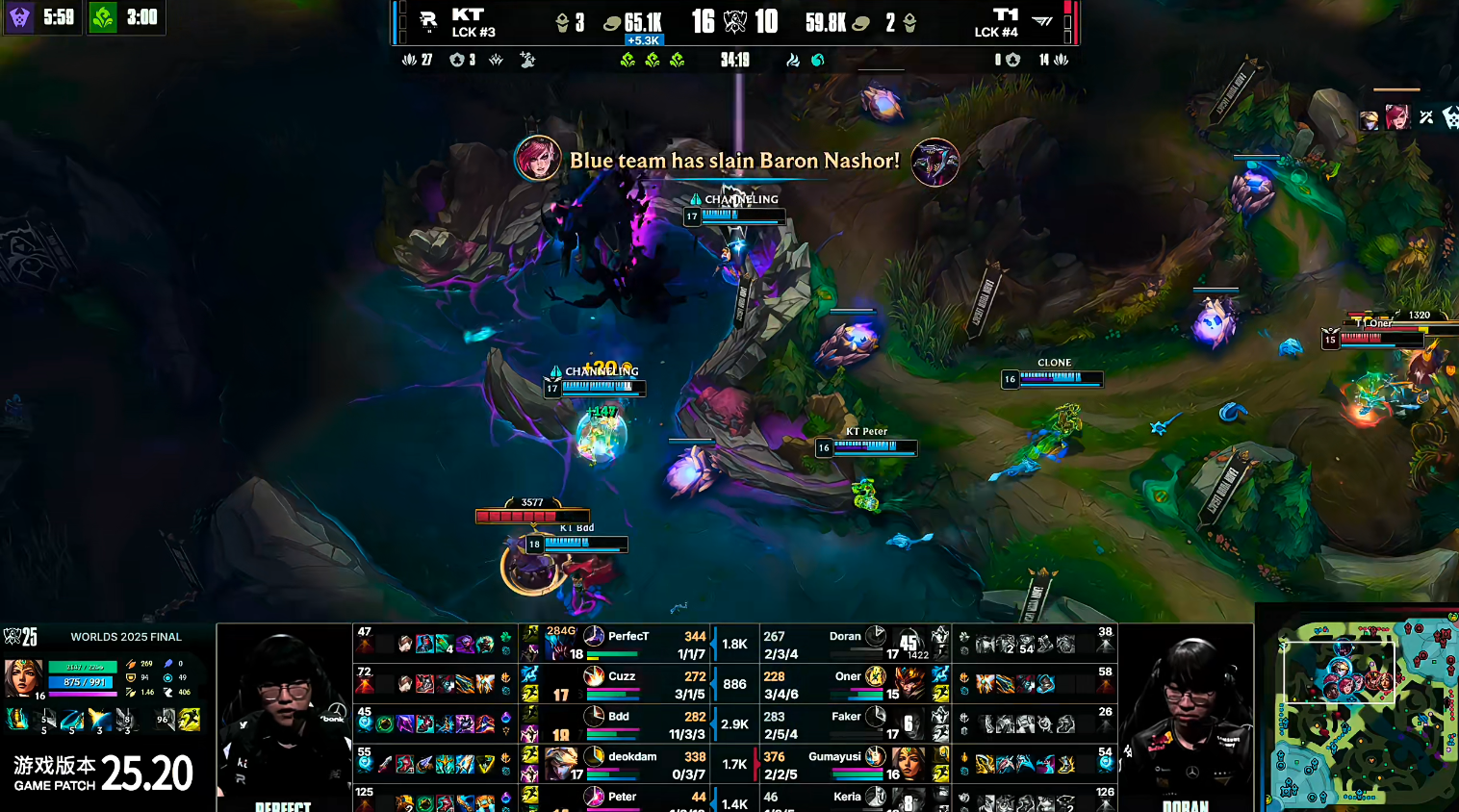 比赛15分钟T1中野在上路主动出手抓Bdd梅尔,KT的支援非常迅速,野辅赶到上路将T1中野击杀,KT随后控下先锋。18分钟Cuzz蔚被T1抓到秒掉,随后小龙团T1将KT其余四人击杀,两队复活后继续争夺小龙打团,KT打出2换5,连续的两波团战,Bdd梅尔输出拉满,反而是Faker有些着急,T1逐渐无法处理Bdd梅尔。